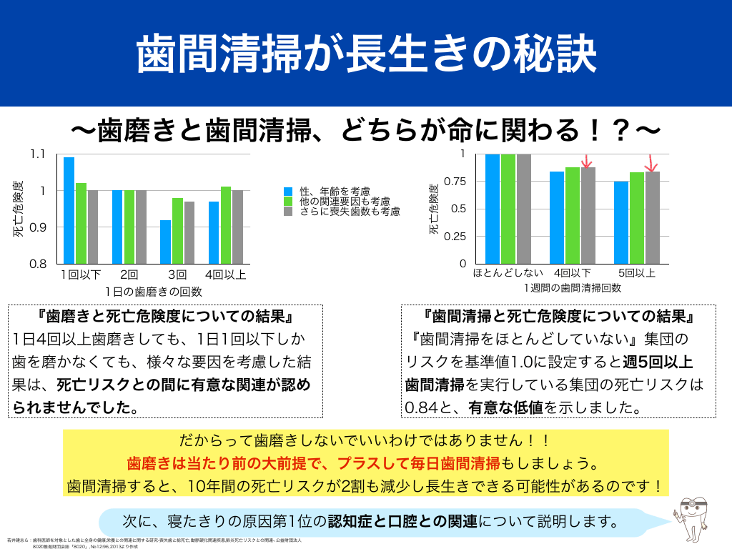 #20. 歯間清掃が長生きの秘訣 〜歯磨きと歯間清掃、どちらが命に関わる!?〜 1 1 性、年齢を考慮 他の関連要因も考慮 さらに喪失歯数も考慮 0.9 0.8 1回以下 2回 3回 4回以上 1日の歯磨きの回数 『歯磨きと死亡危険度についての結果』 死亡危険度 死亡危険度 1.1 0.75 0.5 0.25 0 ほとんどしない 4回以下 5回以上 1週間の歯間清掃回数 『歯間清掃と死亡危険度についての結果』 1日4回以上歯磨きしても、1日1回以下しか 『歯間清掃をほとんどしていない』集団の 歯を磨かなくても、様々な要因を考慮した結 リスクを基準値1.0に設定すると週5回以上 果は、死亡リスクとの間に有意な関連が認め 歯間清掃を実行している集団の死亡リスクは られませんでした。 0.84と、有意な低値を示しました。 だからって歯磨きしないでいいわけではありません!! 歯磨きは当たり前の大前提で、プラスして毎日歯間清掃もしましょう。 歯間清掃すると、10年間の死亡リスクが2割も減少し長生きできる可能性があるのです! 次に、寝たきりの原因第1位の認知症と口腔との関連について説明します。 若井建志ら:歯科医師を対象とした歯と全身の健康,栄養との関連に関する研究-喪失歯と総死亡,動脈硬化関連疾患,肺炎死亡リスクとの関連-.公益財団法人 8020推進財団会誌「8020」,No12:96,2013より作成