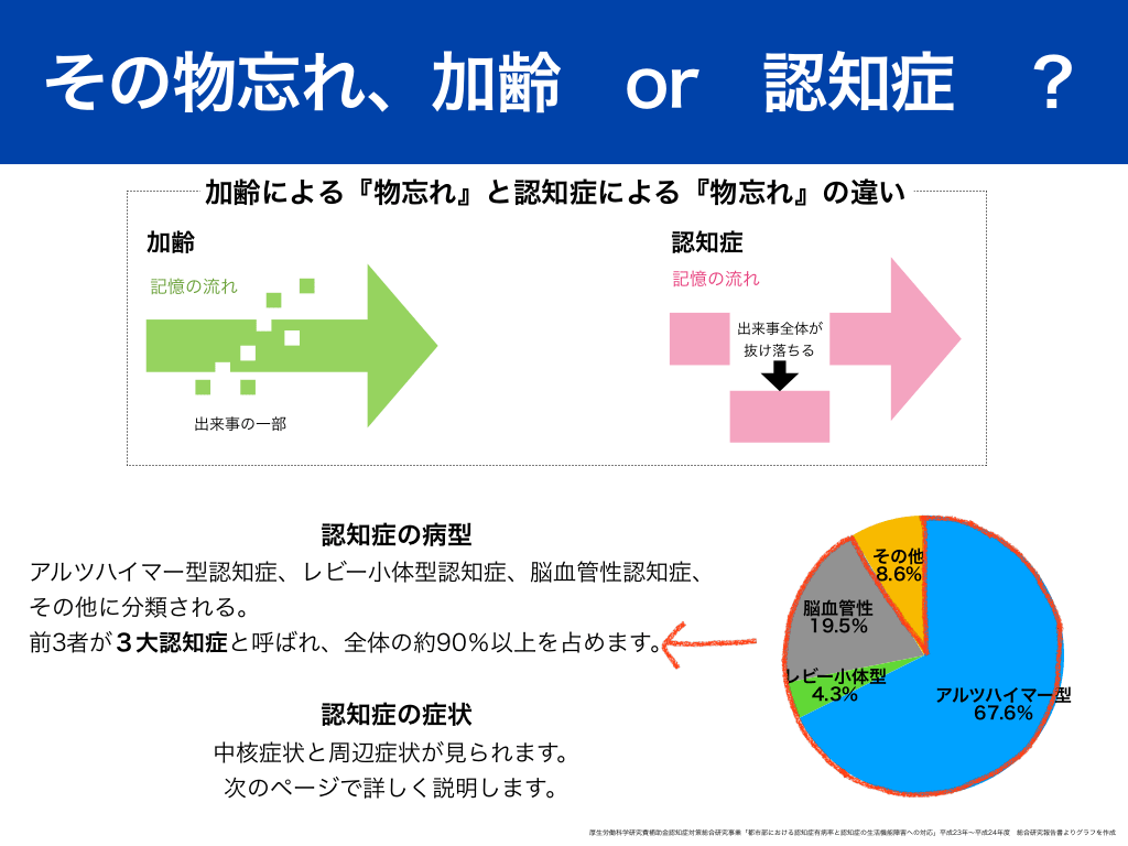 #21. その物忘れ、加齢 or 認知症 ? 加齢による『物忘れ』と認知症による『物忘れ』の違い 加齢 認知症 記憶の流れ 記憶の流れ 出来事全体が 抜け落ちる 出来事の一部 認知症の病型 アルツハイマー型認知症、レビー小体型認知症、脳血管性認知症、 その他に分類される。 前3者が3大認知症と呼ばれ、全体の約90%以上を占めます。 認知症の症状 その他 8.6% 脳血管性 19.5% レビー小体型 4.3% アルツハイマー型 67.6% 中核症状と周辺症状が見られます。 次のページで詳しく説明します。 厚生労働科学研究費補助金認知症対策総合研究事業「都市部における認知症有病率と認知症の生活機能障害への対応」平成23年〜平成24年度 総合研究報告書よりグラフを作成