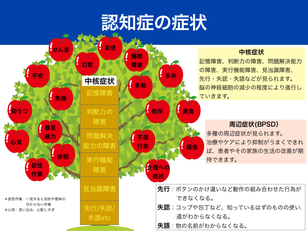 #22. 認知症の症状 妄想 せん妄 中核症状 睡眠 幻覚 不安 中核症状 焦燥 抑うつ の障害、実行機能障害、見当識障害、 多弁 脳の神経細胞の減少の程度により進行し 記憶障害 問題解決 能力の障害 暴力 心気 徘徊 仮性 作業 先行・失認・失語などが見られます。 多動 ていきます。 依存 判断力の 障害 暴言 実行機能 障害 異食 周辺症状(BPSD) 多種の周辺症状が見られます。 不潔 行為 過食 治療やケアにより抑制がうまくできれ ば、患者やその家族の生活の改善が期 待できます。 介護への 抵抗 見当識障害 先行:ボタンのかけ違いなど動作の組み合わせた行為が できなくなる。 *仮性作業:一見すると目的や意味の 分からない作業 *心気:思い込み、心配しすぎ 記憶障害、判断力の障害、問題解決能力 障害 先行/失認/ 失語etc 失認:コップや包丁など、知っているはずのものの使い. 道がわからなくなる。 失語:物の名前がわからなくなる。