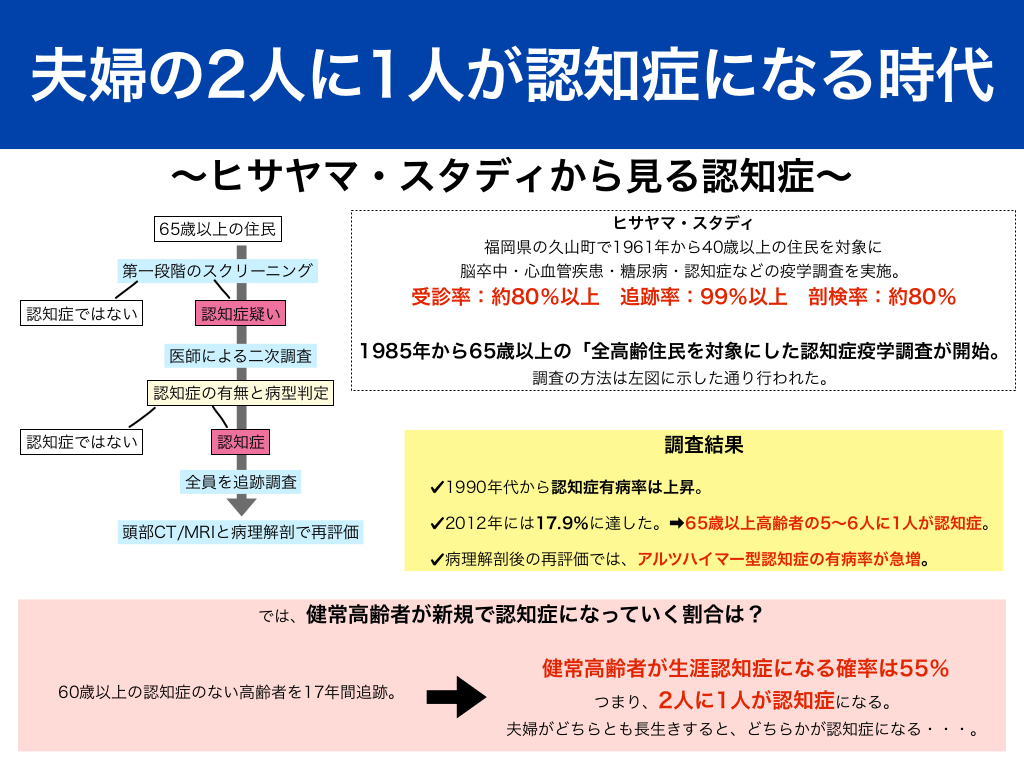 #23. 夫婦の2人に1人が認知症になる時代 〜ヒサヤマ・スタディから見る認知症〜 65歳以上の住民 ヒサヤマ・スタディ 福岡県の久山町で1961年から40歳以上の住民を対象に 第一段階のスクリーニング 脳卒中・心血管疾患・糖尿病・認知症などの疫学調査を実施。 認知症ではない 受診率:約80%以上 認知症疑い 医師による二次調査 剖検率:約80% 1985年から65歳以上の「全高齢住民を対象にした認知症疫学調査が開始。 認知症の有無と病型判定 認知症ではない 追跡率:99%以上 認知症 全員を追跡調査 頭部CT/MRIと病理解剖で再評価 調査の方法は左図に示した通り行われた。 調査結果 1990年代から認知症有病率は上昇。 2012年には17.9%に達した。 65歳以上高齢者の5〜6人に1人が認知症。 病理解剖後の再評価では、アルツハイマー型認知症の有病率が急増。 では、健常高齢者が新規で認知症になっていく割合は? 健常高齢者が生涯認知症になる確率は55% 60歳以上の認知症のない高齢者を17年間追跡。 つまり、2人に1人が認知症になる。 ➡︎ 夫婦がどちらとも長生きすると、どちらかが認知症になる・・・。