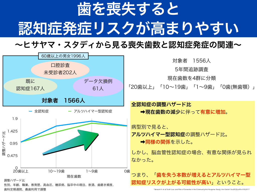 #24. ➡︎ ➡︎ 歯を喪失すると 認知症発症リスクが高まりやすい 〜ヒサヤマ・スタディから見る喪失歯数と認知症発症の関連〜 60歳以上の男女1996人 対象者 口腔診査 5年間追跡調査 未受診者202人 既に データ欠損例 認知症167人 61人 対象者 現在歯数を4群に分類 「20歯以上」「10〜19歯」「1〜9歯」「0歯(無歯顎)」 1566人 全認知症 1556人 全認知症の調整ハザード比 現在歯数の減少に伴って有意に増加。 アルツハイマー型認知症 調整ハザード比 1.9 病型別で見ると、 アルツハイマー型認知症の調整ハザード比。 同様の関係を示した。 1.425 0.95 しかし、脳血管性認知症の場合、有意な関係が見られ なかった。 0.475 0 20歯以上 10〜19歯 1〜9歯 現在歯数 調整ハザード比 性別、年齢、職業、教育歴、高血圧、糖尿病、脳卒中の既往、飲酒、歯磨き頻度、 歯科定期通院、義歯利用で調整 0歯 つまり、「歯を失う本数が増えるとアルツハイマー型 認知症リスクが上がる可能性が高い」ということ。 Takeuchi K et al.:Tooth Loss and Risk of Dementia in the Community:the Hisayama Study,J Am Geriatr Soc,65(5):e95-e100,2017