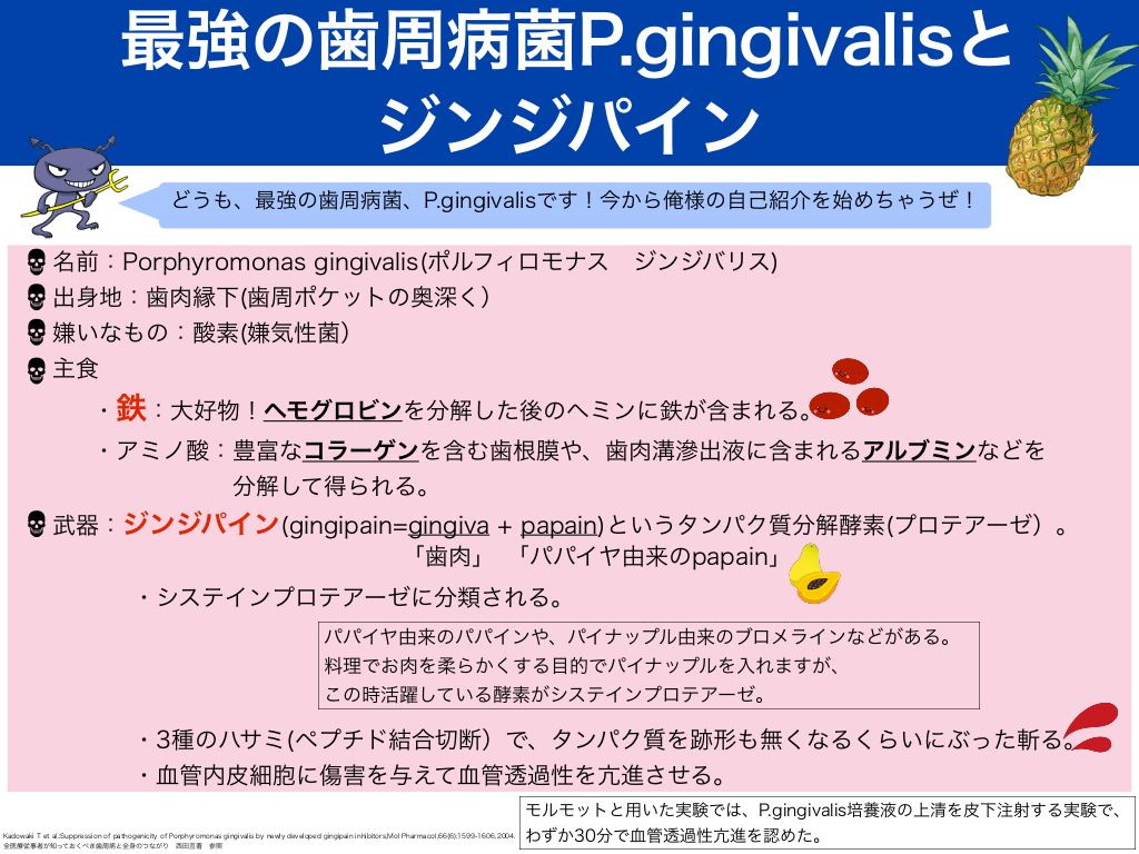 #25. 最強の歯周病菌P.gingivalisと ジンジパイン どうも、最強の歯周病菌、P.gingivalisです!今から俺様の自己紹介を始めちゃうぜ! 名前:Porphyromonas gingivalis(ポルフィロモナス ジンジバリス) 出身地:歯肉縁下(歯周ポケットの奥深く) 嫌いなもの:酸素(嫌気性菌) 主食 ・鉄:大好物!ヘモグロビンを分解した後のヘミンに鉄が含まれる。 ・アミノ酸:豊富なコラーゲンを含む歯根膜や、歯肉溝滲出液に含まれるアルブミンなどを 分解して得られる。 武器:ジンジパイン(gingipain=gingiva + papain)というタンパク質分解酵素(プロテアーゼ)。 「歯肉」 「パパイヤ由来のpapain」 ・システインプロテアーゼに分類される。 パパイヤ由来のパパインや、パイナップル由来のブロメラインなどがある。 料理でお肉を柔らかくする目的でパイナップルを入れますが、 この時活躍している酵素がシステインプロテアーゼ。 ・3種のハサミ(ペプチド結合切断)で、タンパク質を跡形も無くなるくらいにぶった斬る。 ・血管内皮細胞に傷害を与えて血管透過性を亢進させる。 モルモットと用いた実験では、P.gingivalis培養液の上清を皮下注射する実験で、 Kadowaki T et al.:Suppression of pathogenicity of Porphyromonas gingivalis by newly developed gingipain inhibitors,Mol Pharmacol,66(6):1599-1606,2004. 全医療従事者が知っておくべき歯周病と全身のつながり 西田亙著 参照 わずか30分で血管透過性亢進を認めた。