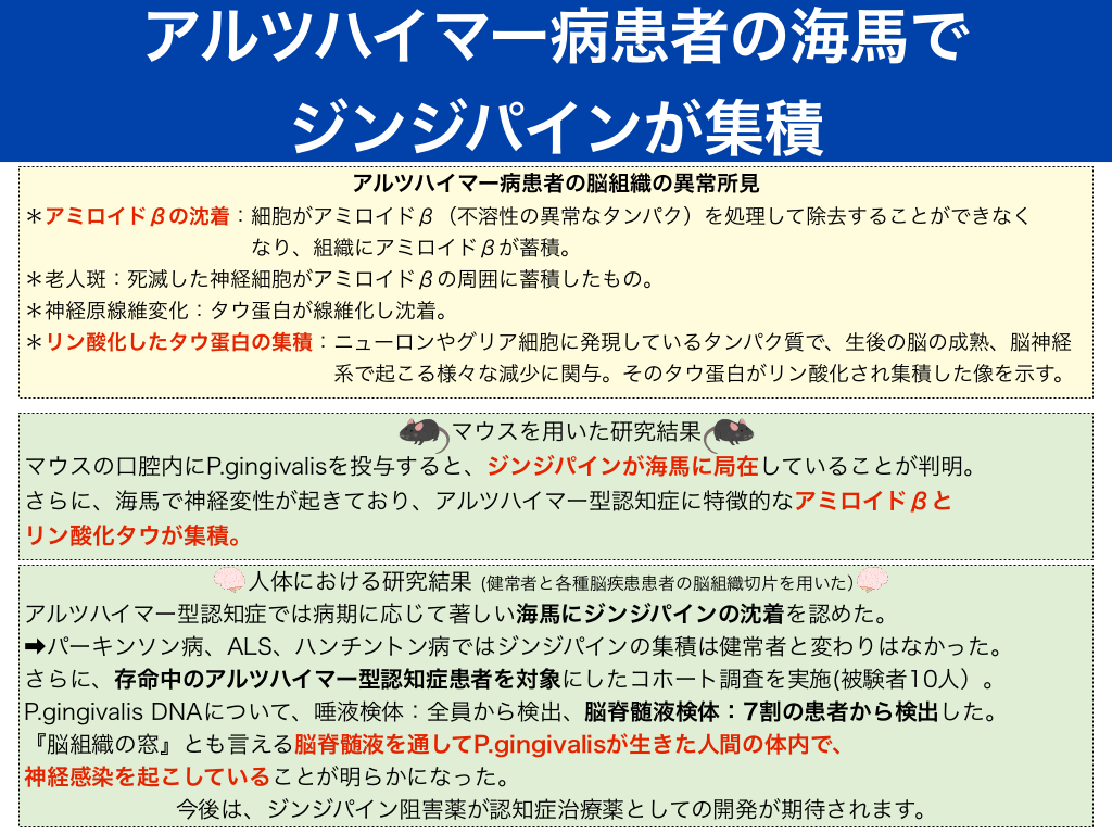 #26. ➡︎ アルツハイマー病患者の海馬で ジンジパインが集積 アルツハイマー病患者の脳組織の異常所見 *アミロイドβの沈着:細胞がアミロイドβ(不溶性の異常なタンパク)を処理して除去することができなく なり、組織にアミロイドβが蓄積。 *老人斑:死滅した神経細胞がアミロイドβの周囲に蓄積したもの。 *神経原線維変化:タウ蛋白が線維化し沈着。 *リン酸化したタウ蛋白の集積:ニューロンやグリア細胞に発現しているタンパク質で、生後の脳の成熟、脳神経 系で起こる様々な減少に関与。そのタウ蛋白がリン酸化され集積した像を示す。 マウスを用いた研究結果 マウスの口腔内にP.gingivalisを投与すると、ジンジパインが海馬に局在していることが判明。 さらに、海馬で神経変性が起きており、アルツハイマー型認知症に特徴的なアミロイドβと リン酸化タウが集積。 人体における研究結果 (健常者と各種脳疾患患者の脳組織切片を用いた) アルツハイマー型認知症では病期に応じて著しい海馬にジンジパインの沈着を認めた。 パーキンソン病、ALS、ハンチントン病ではジンジパインの集積は健常者と変わりはなかった。 さらに、存命中のアルツハイマー型認知症患者を対象にしたコホート調査を実施(被験者10人)。 P.gingivalis DNAについて、唾液検体:全員から検出、脳脊髄液検体:7割の患者から検出した。 『脳組織の窓』とも言える脳脊髄液を通してP.gingivalisが生きた人間の体内で、 神経感染を起こしていることが明らかになった。 今後は、ジンジパイン阻害薬が認知症治療薬としての開発が期待されます。