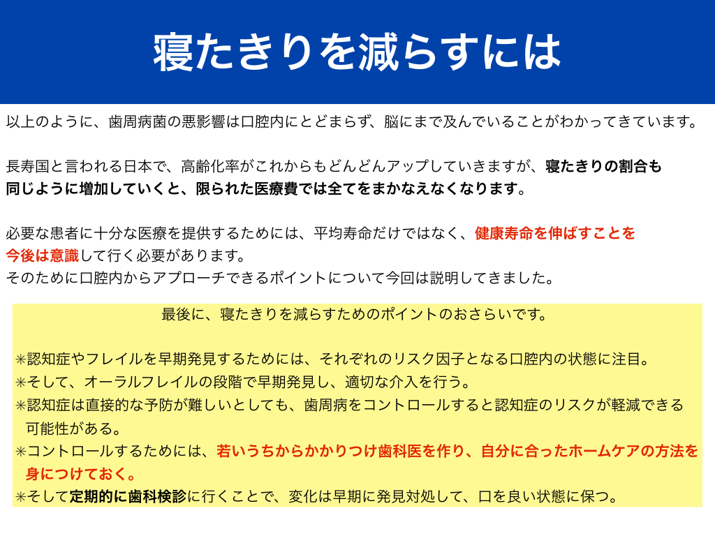 #27. ✳︎ ✳︎ ✳︎ ✳︎ ✳︎ 寝たきりを減らすには 以上のように、歯周病菌の悪影響は口腔内にとどまらず、脳にまで及んでいることがわかってきています。 長寿国と言われる日本で、高齢化率がこれからもどんどんアップしていきますが、寝たきりの割合も 同じように増加していくと、限られた医療費では全てをまかなえなくなります。 必要な患者に十分な医療を提供するためには、平均寿命だけではなく、健康寿命を伸ばすことを 今後は意識して行く必要があります。 そのために口腔内からアプローチできるポイントについて今回は説明してきました。 最後に、寝たきりを減らすためのポイントのおさらいです。 認知症やフレイルを早期発見するためには、それぞれのリスク因子となる口腔内の状態に注目。 そして、オーラルフレイルの段階で早期発見し、適切な介入を行う。 認知症は直接的な予防が難しいとしても、歯周病をコントロールすると認知症のリスクが軽減できる 可能性がある。 コントロールするためには、若いうちからかかりつけ歯科医を作り、自分に合ったホームケアの方法を 身につけておく。 そして定期的に歯科検診に行くことで、変化は早期に発見対処して、口を良い状態に保つ。