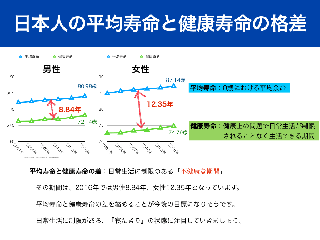 #3. 日本人の平均寿命と健康寿命の格差 平均寿命 健康寿命 平均寿命 男性 健康寿命 女性 90 90 87.14歳 80.98歳 82.5 平均寿命:0歳における平均余命 85 8.84年 75 72.14歳 67.5 12.35年 80 健康寿命:健康上の問題で日常生活が制限 75 74.79歳 60 されることなく生活できる期間 70 年 16 20 年 13 20 年 10 20 年 07 20 年 04 20 年 01 20 年 16 20 年 13 20 年 10 厚生労働白書 20 年 07 20 年 04 20 年 01 20 平成28年版 P12を参照 平均寿命と健康寿命の差:日常生活に制限のある「不健康な期間」 その期間は、2016年では男性8.84年、女性12.35年となっています。 平均寿命と健康寿命の差を縮めることが今後の目標になりそうです。 日常生活に制限がある、『寝たきり』の状態に注目していきましょう。