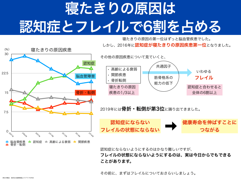 #4. 寝たきりの原因は 認知症とフレイルで6割を占める 寝たきりの原因の第一位はずっと脳血管疾患でした。 しかし、2016年に認知症が寝たきりの原因疾患第一位となりました。 寝たきりの原因疾患 (%) 30 その他の原因疾患について見ていくと、 認知症 22.5 脳血管障害 骨折・転倒 15 • 高齢による衰弱 • 関節疾患 • 骨折転倒 共通因子 いわゆる フレイル 筋骨格系の 能力の低下 寝たきりの原因 疾患の1/3以上 認知症と合わせると 全体の6割以上 2019年には骨折・転倒が第3位に踊り出てきました。 7.5 0 フレイルの状態にならない つながる 年 19 年 16 高齢による衰弱 健康寿命を伸ばすことに 20 20 年 13 年 10 年 年 07 04 年 01 認知症 20 20 20 20 20 脳血管疾患 骨折・転倒 認知症にならない 関節疾患 認知症にならないようにするのはかなり難しいですが、 フレイルの状態にならないようにするのは、実は今日からでもできる ことがあります。 その前に、まずはフレイルについておさらいしましょう。 厚生労働省 国民生活基礎調査よりグラフを作成