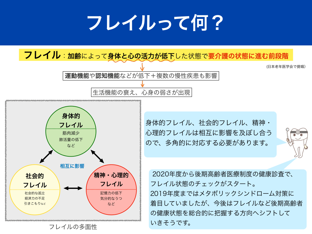 #5. フレイルって何? フレイル:加齢によって身体と心の活力が低下した状態で要介護の状態に進む前段階 (日本老年医学会で提唱) 運動機能や認知機能などが低下+複数の慢性疾患も影響 生活機能の衰え、心身の弱さが出現 身体的 フレイル 身体的フレイル、社会的フレイル、精神・ 心理的フレイルは相互に影響を及ぼし合う ので、多角的に対応する必要があります。 筋肉減少 肺活量の低下 など 相互に影響 2020年度から後期高齢者医療制度の健康診査で、 社会的 フレイル 精神・心理的 フレイル フレイル状態のチェックがスタート。 社会的な孤立 経済力の不足 記憶力の低下 気分的なうつ 2019年度まではメタボリックシンドローム対策に 引きこもりなど など 着目していましたが、今後はフレイルなど後期高齢者 の健康状態を総合的に把握する方向へシフトして フレイルの多面性 いきそうです。