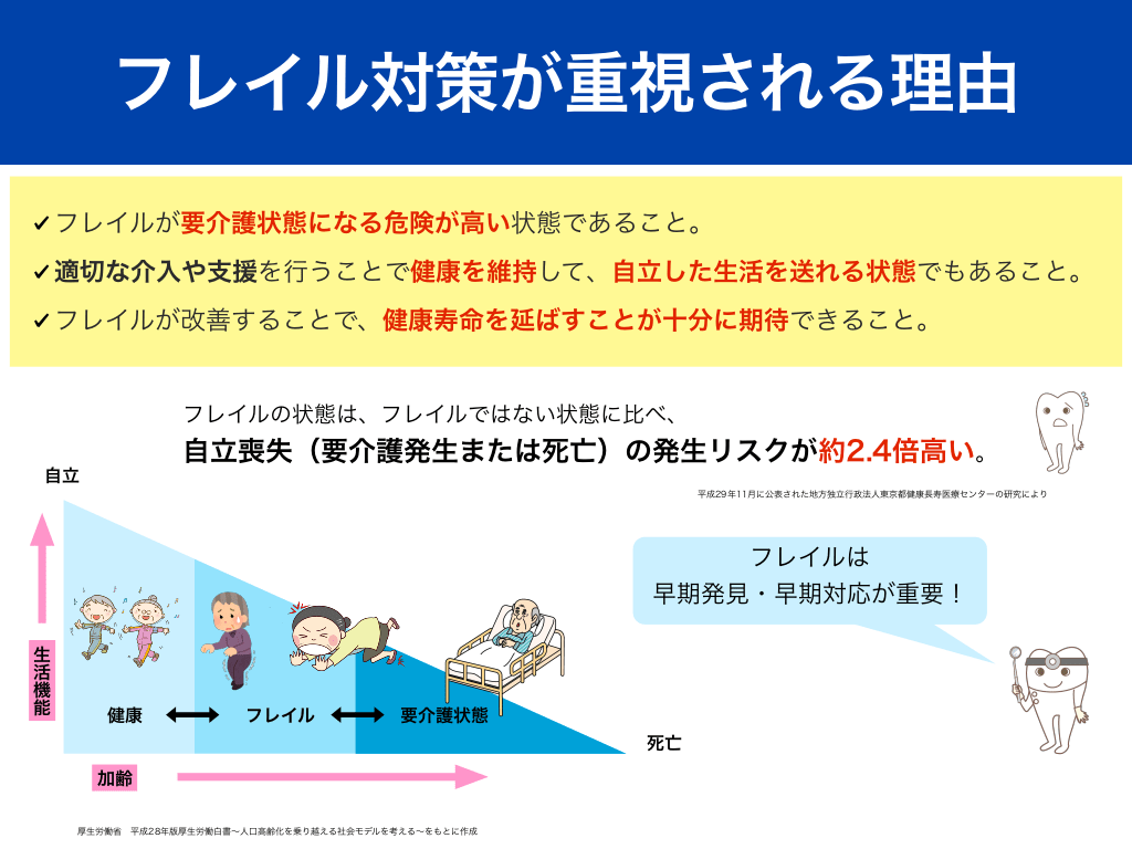 #6. フレイル対策が重視される理由 フレイルが要介護状態になる危険が高い状態であること。 適切な介入や支援を行うことで健康を維持して、自立した生活を送れる状態でもあること。 フレイルが改善することで、健康寿命を延ばすことが十分に期待できること。 フレイルの状態は、フレイルではない状態に比べ、 自立喪失(要介護発生または死亡)の発生リスクが約2.4倍高い。 自立 平成29年11月に公表された地方独立行政法人東京都健康長寿医療センターの研究により フレイルは 早期発見・早期対応が重要! 生 活 機 能 健康 フレイル 要介護状態 死亡 加齢 厚生労働省 平成28年版厚生労働白書〜人口高齢化を乗り越える社会モデルを考える〜をもとに作成