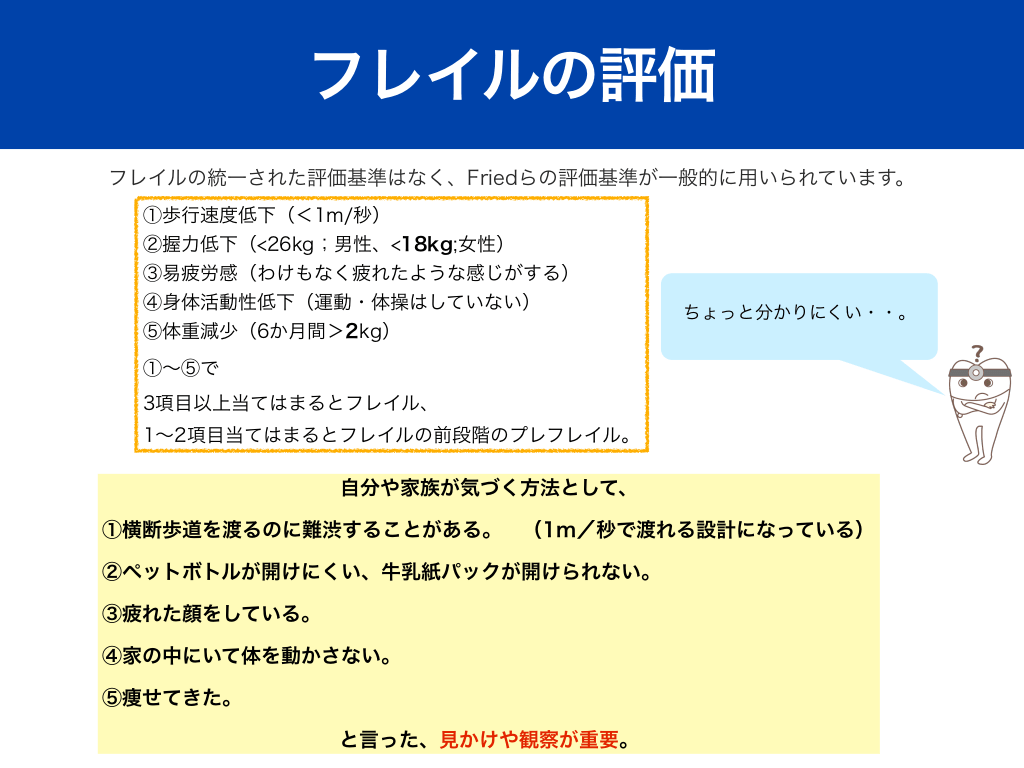 #7. フレイルの評価 フレイルの統一された評価基準はなく、Friedらの評価基準が一般的に用いられています。 ①歩行速度低下(<1m/秒) ②握力低下(<26kg;男性、<18kg;女性) ③易疲労感(わけもなく疲れたような感じがする) ④身体活動性低下(運動・体操はしていない) ⑤体重減少(6か月間>2kg) ちょっと分かりにくい・・。 ①〜⑤で 3項目以上当てはまるとフレイル、 1〜2項目当てはまるとフレイルの前段階のプレフレイル。 自分や家族が気づく方法として、 ①横断歩道を渡るのに難渋することがある。 (1m/秒で渡れる設計になっている) ②ペットボトルが開けにくい、牛乳紙パックが開けられない。 ③疲れた顔をしている。 ④家の中にいて体を動かさない。 ⑤痩せてきた。 と言った、見かけや観察が重要。