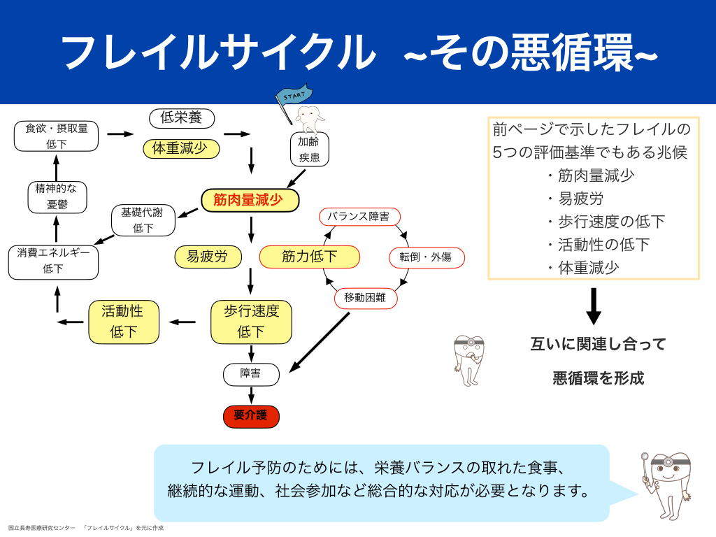 #8. フレイルサイクル ~その悪循環~ 低栄養 食欲・摂取量 低下 加齢 体重減少 精神的な 疾患 筋肉量減少 憂鬱 基礎代謝 バランス障害 低下 消費エネルギー 易疲労 筋力低下 転倒・外傷 低下 前ページで示したフレイルの 5つの評価基準でもある兆候 ・筋肉量減少 ・易疲労 ・歩行速度の低下 ・活動性の低下 ・体重減少 移動困難 活動性 低下 歩行速度 低下 障害 互いに関連し合って 悪循環を形成 要介護 フレイル予防のためには、栄養バランスの取れた食事、 継続的な運動、社会参加など総合的な対応が必要となります。 国立長寿医療研究センター 「フレイルサイクル」を元に作成