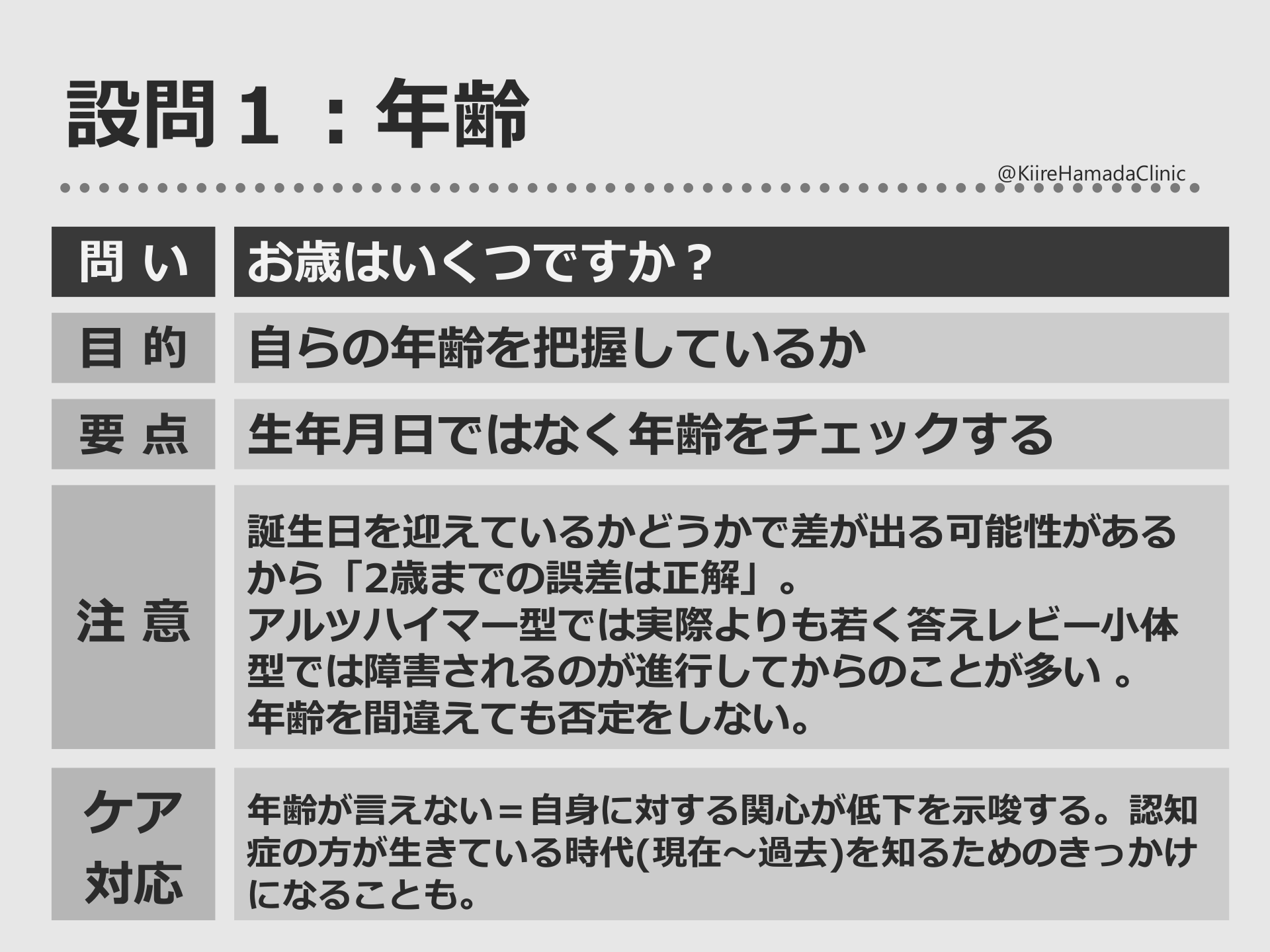 #10. 設問1:年齢 @KiireHamadaClinic 問い お歳はいくつですか? 目的 自らの年齢を把握しているか 要点 生年月日ではなく年齢をチェックする 注意 誕生日を迎えているかどうかで差が出る可能性がある から「2歳までの誤差は正解」。 アルツハイマー型では実際よりも若く答えレビー小体 型では障害されるのが進行してからのことが多い 。 年齢を間違えても否定をしない。 ケア 対応 年齢が言えない=自身に対する関心が低下を示唆する。認知 症の方が生きている時代(現在~過去)を知るためのきっかけ になることも。