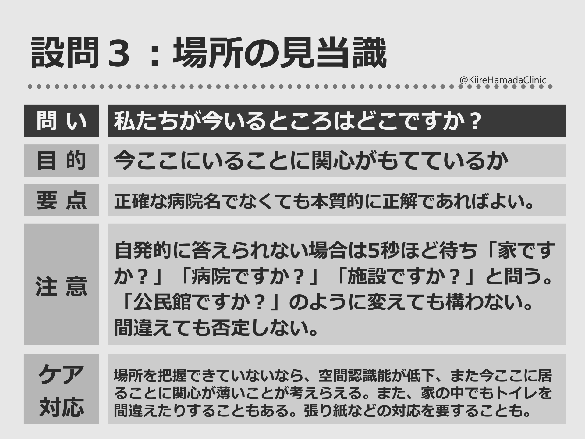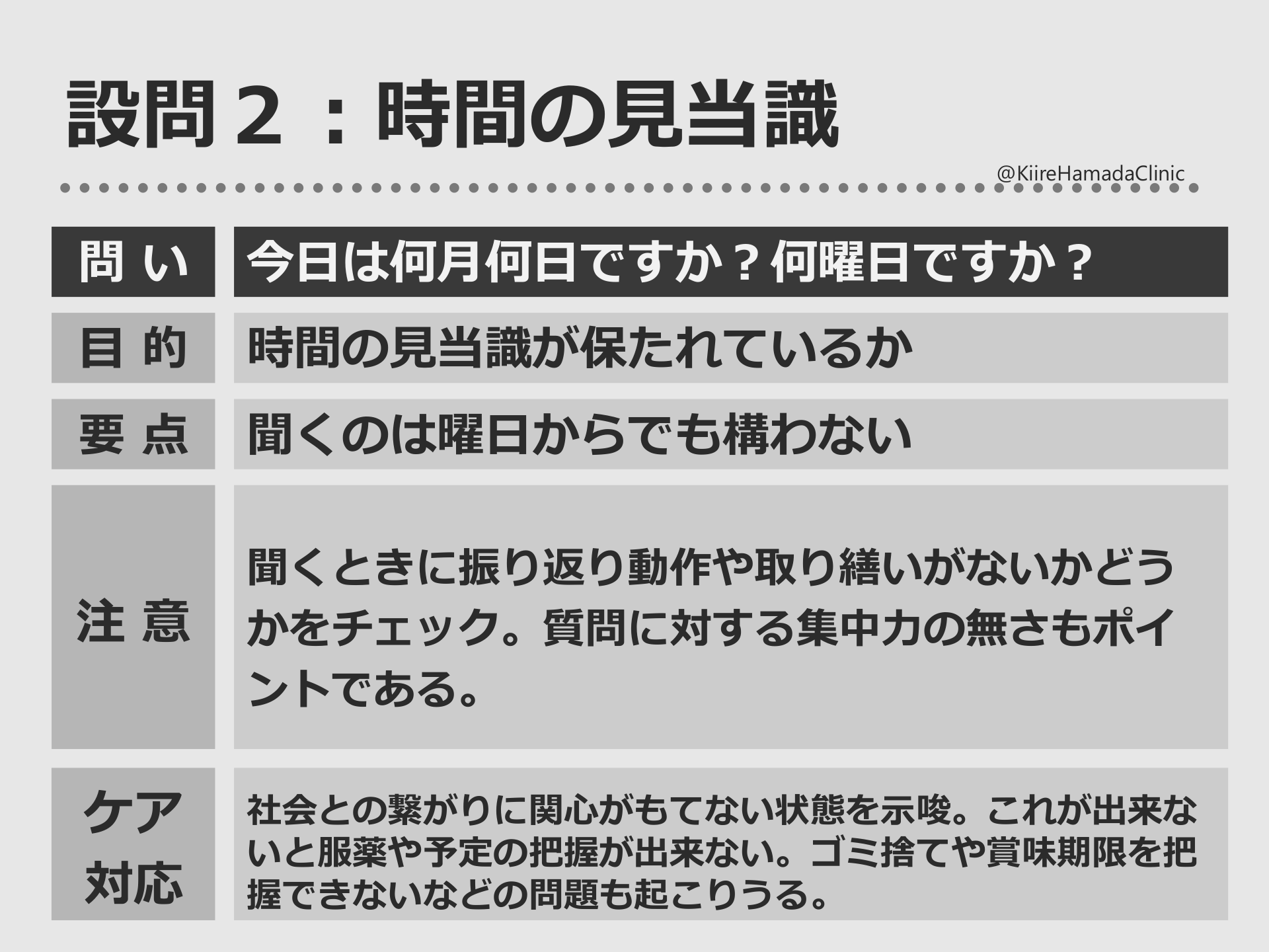 #11. 設問2:時間の見当識 @KiireHamadaClinic 問い 今日は何月何日ですか?何曜日ですか? 目的 時間の見当識が保たれているか 要点 聞くのは曜日からでも構わない 注意 聞くときに振り返り動作や取り繕いがないかどう かをチェック。質問に対する集中力の無さもポイ ントである。 ケア 対応 社会との繋がりに関心がもてない状態を示唆。これが出来な いと服薬や予定の把握が出来ない。ゴミ捨てや賞味期限を把 握できないなどの問題も起こりうる。