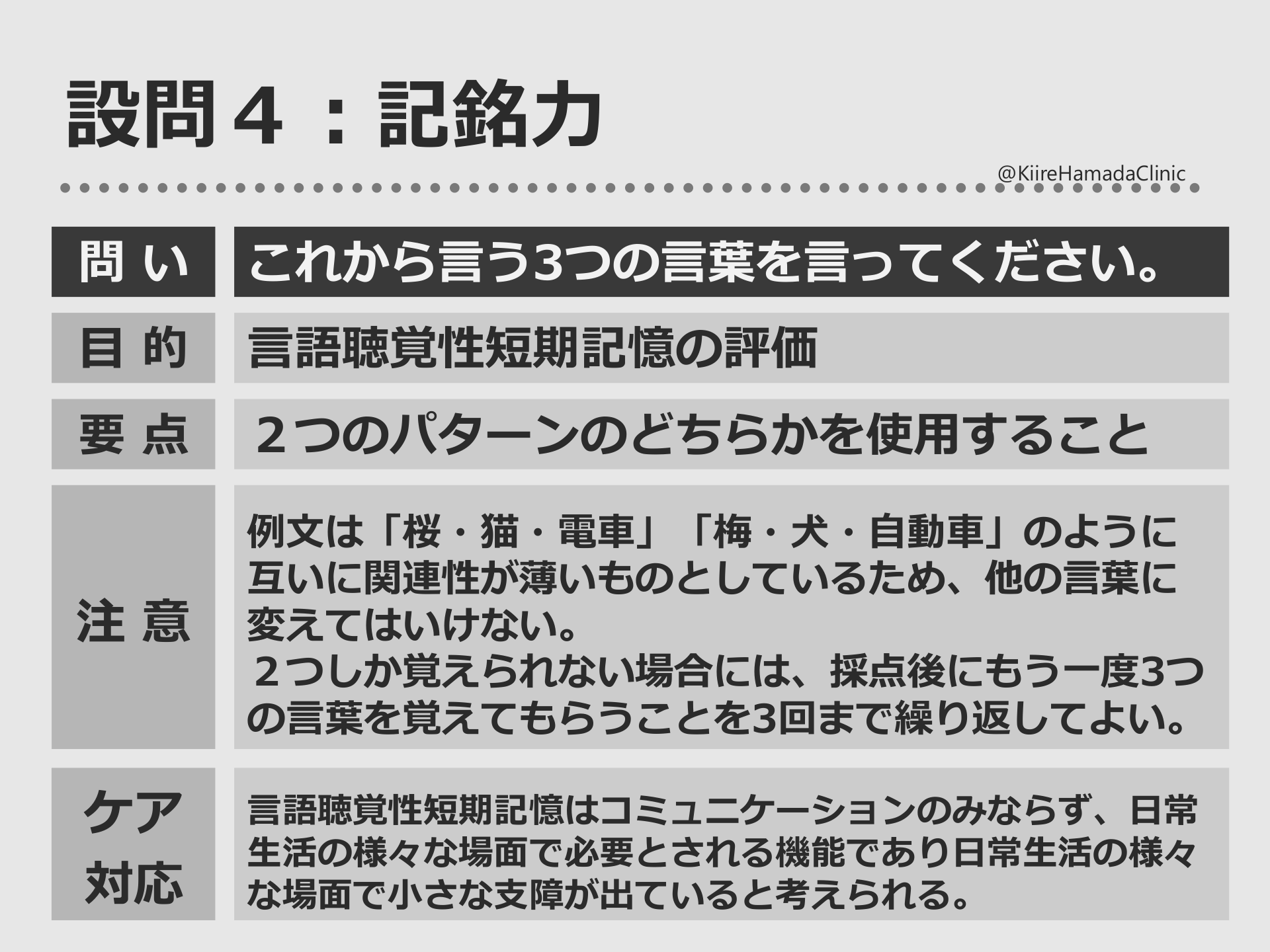 #13. 設問4:記銘力 @KiireHamadaClinic 問い これから言う3つの言葉を言ってください。 目的 言語聴覚性短期記憶の評価 要点 2つのパターンのどちらかを使用すること 注意 例文は「桜・猫・電車」「梅・犬・自動車」のように 互いに関連性が薄いものとしているため、他の言葉に 変えてはいけない。 2つしか覚えられない場合には、採点後にもう一度3つ の言葉を覚えてもらうことを3回まで繰り返してよい。 ケア 対応 言語聴覚性短期記憶はコミュニケーションのみならず、日常 生活の様々な場面で必要とされる機能であり日常生活の様々 な場面で小さな支障が出ていると考えられる。