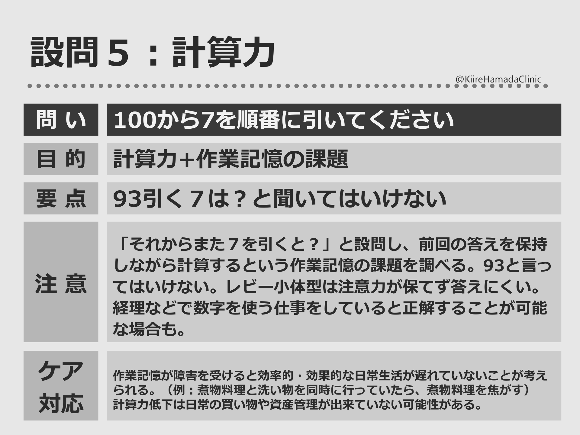 #14. 設問5:計算力 @KiireHamadaClinic 問い 100から7を順番に引いてください 目的 計算力+作業記憶の課題 要点 93引く7は?と聞いてはいけない 注意 「それからまた7を引くと?」と設問し、前回の答えを保持 しながら計算するという作業記憶の課題を調べる。93と言っ てはいけない。レビー小体型は注意力が保てず答えにくい。 経理などで数字を使う仕事をしていると正解することが可能 な場合も。 ケア 対応 作業記憶が障害を受けると効率的・効果的な日常生活が遅れていないことが考え られる。(例:煮物料理と洗い物を同時に行っていたら、煮物料理を焦がす) 計算力低下は日常の買い物や資産管理が出来ていない可能性がある。