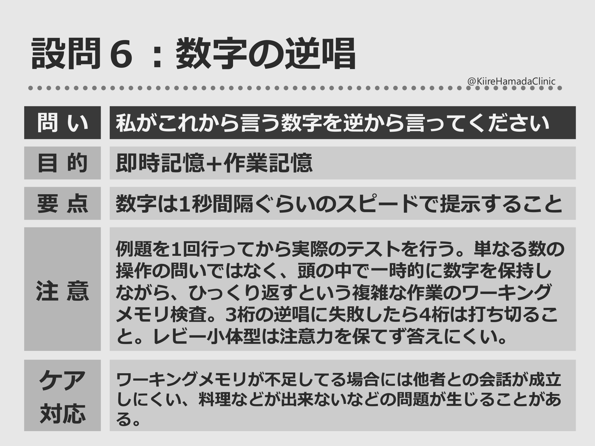 #15. 設問6:数字の逆唱 @KiireHamadaClinic 問い 私がこれから言う数字を逆から言ってください 目的 即時記憶+作業記憶 要点 数字は1秒間隔ぐらいのスピードで提示すること 注意 例題を1回行ってから実際のテストを行う。単なる数の 操作の問いではなく、頭の中で一時的に数字を保持し ながら、ひっくり返すという複雑な作業のワーキング メモリ検査。3桁の逆唱に失敗したら4桁は打ち切るこ と。レビー小体型は注意力を保てず答えにくい。 ケア 対応 ワーキングメモリが不足してる場合には他者との会話が成立 しにくい、料理などが出来ないなどの問題が生じることがあ る。