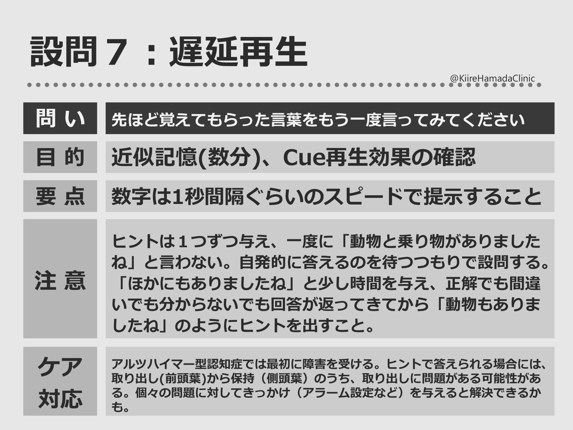 #16. 設問7:遅延再生 @KiireHamadaClinic 問い 先ほど覚えてもらった言葉をもう一度言ってみてください 目的 近似記憶(数分)、Cue再生効果の確認 要点 数字は1秒間隔ぐらいのスピードで提示すること 注意 ヒントは1つずつ与え、一度に「動物と乗り物がありました ね」と言わない。自発的に答えるのを待つつもりで設問する。 「ほかにもありましたね」と少し時間を与え、正解でも間違 いでも分からないでも回答が返ってきてから「動物もありま したね」のようにヒントを出すこと。 ケア 対応 アルツハイマー型認知症では最初に障害を受ける。ヒントで答えられる場合には、 取り出し(前頭葉)から保持(側頭葉)のうち、取り出しに問題がある可能性があ る。個々の問題に対してきっかけ(アラーム設定など)を与えると解決できるか も。