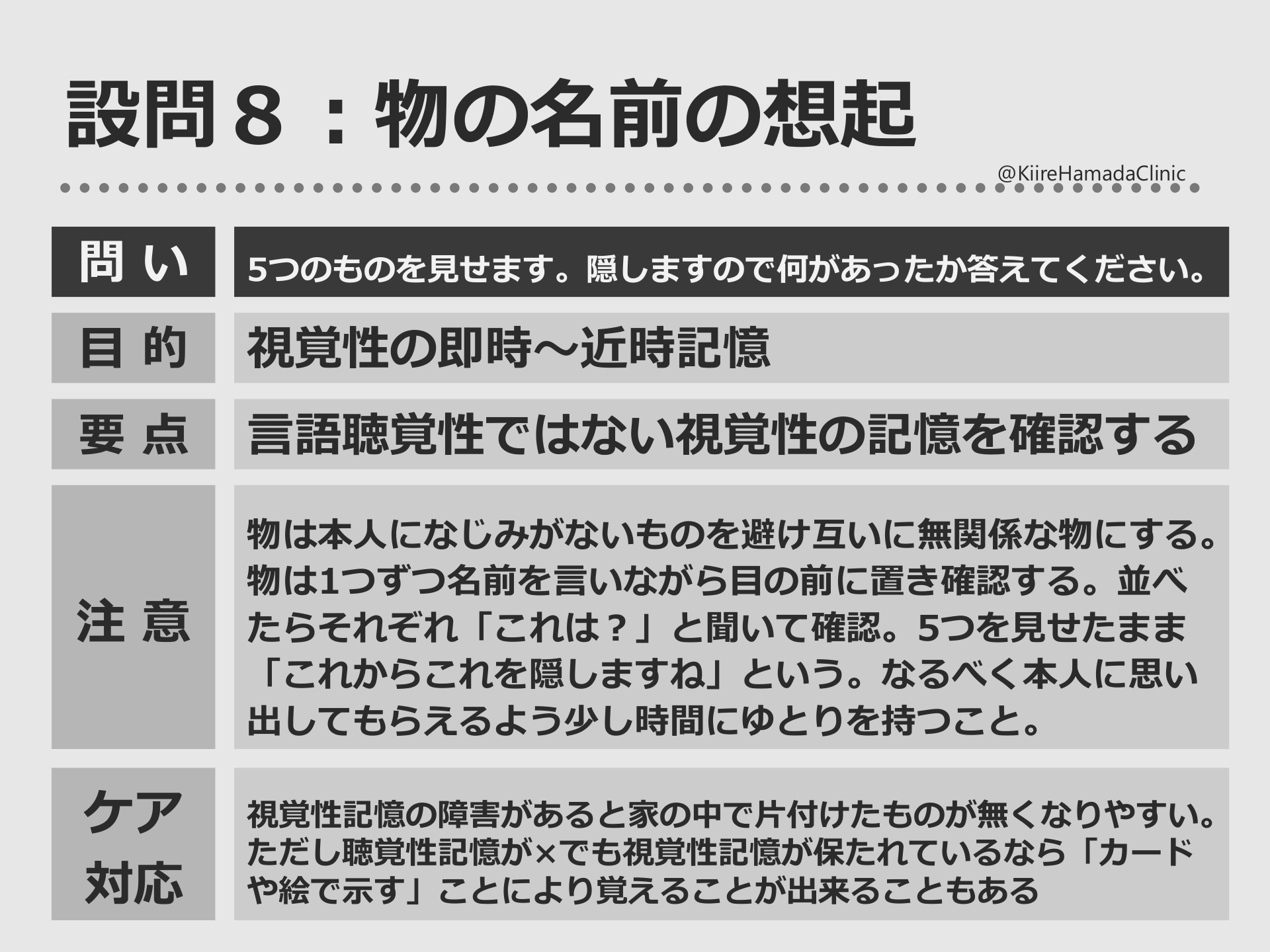 #17. 設問8:物の名前の想起 @KiireHamadaClinic 問い 5つのものを見せます。隠しますので何があったか答えてください。 目的 視覚性の即時~近時記憶 要点 言語聴覚性ではない視覚性の記憶を確認する 注意 物は本人になじみがないものを避け互いに無関係な物にする。 物は1つずつ名前を言いながら目の前に置き確認する。並べ たらそれぞれ「これは?」と聞いて確認。5つを見せたまま 「これからこれを隠しますね」という。なるべく本人に思い 出してもらえるよう少し時間にゆとりを持つこと。 ケア 対応 視覚性記憶の障害があると家の中で片付けたものが無くなりやすい。 ただし聴覚性記憶が×でも視覚性記憶が保たれているなら「カード や絵で示す」ことにより覚えることが出来ることもある