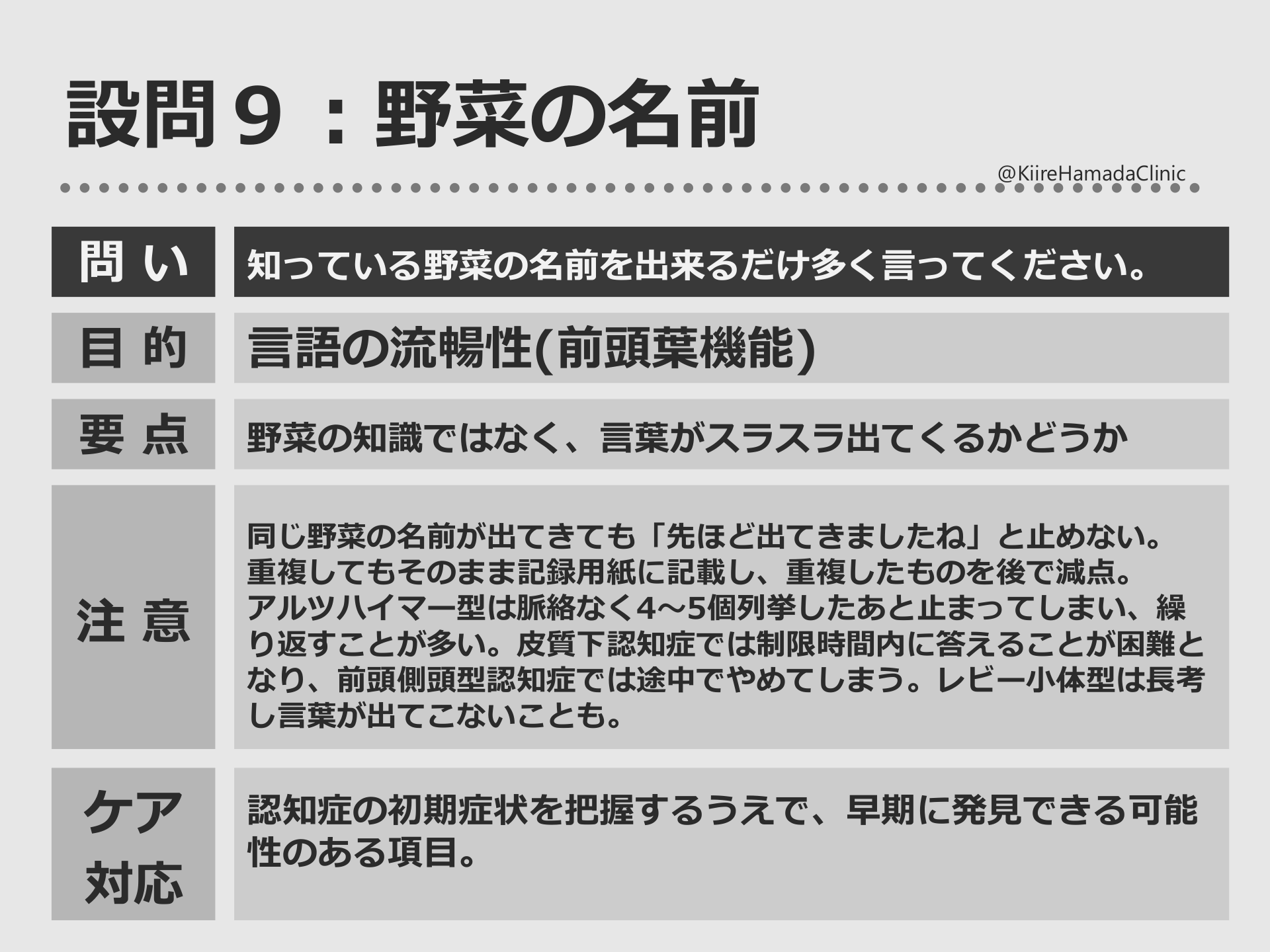 #18. 設問9:野菜の名前 @KiireHamadaClinic 問い 知っている野菜の名前を出来るだけ多く言ってください。 目的 言語の流暢性(前頭葉機能) 要点 野菜の知識ではなく、言葉がスラスラ出てくるかどうか 注意 同じ野菜の名前が出てきても「先ほど出てきましたね」と止めない。 重複してもそのまま記録用紙に記載し、重複したものを後で減点。 アルツハイマー型は脈絡なく4~5個列挙したあと止まってしまい、繰 り返すことが多い。皮質下認知症では制限時間内に答えることが困難と なり、前頭側頭型認知症では途中でやめてしまう。レビー小体型は長考 し言葉が出てこないことも。 ケア 対応 認知症の初期症状を把握するうえで、早期に発見できる可能 性のある項目。