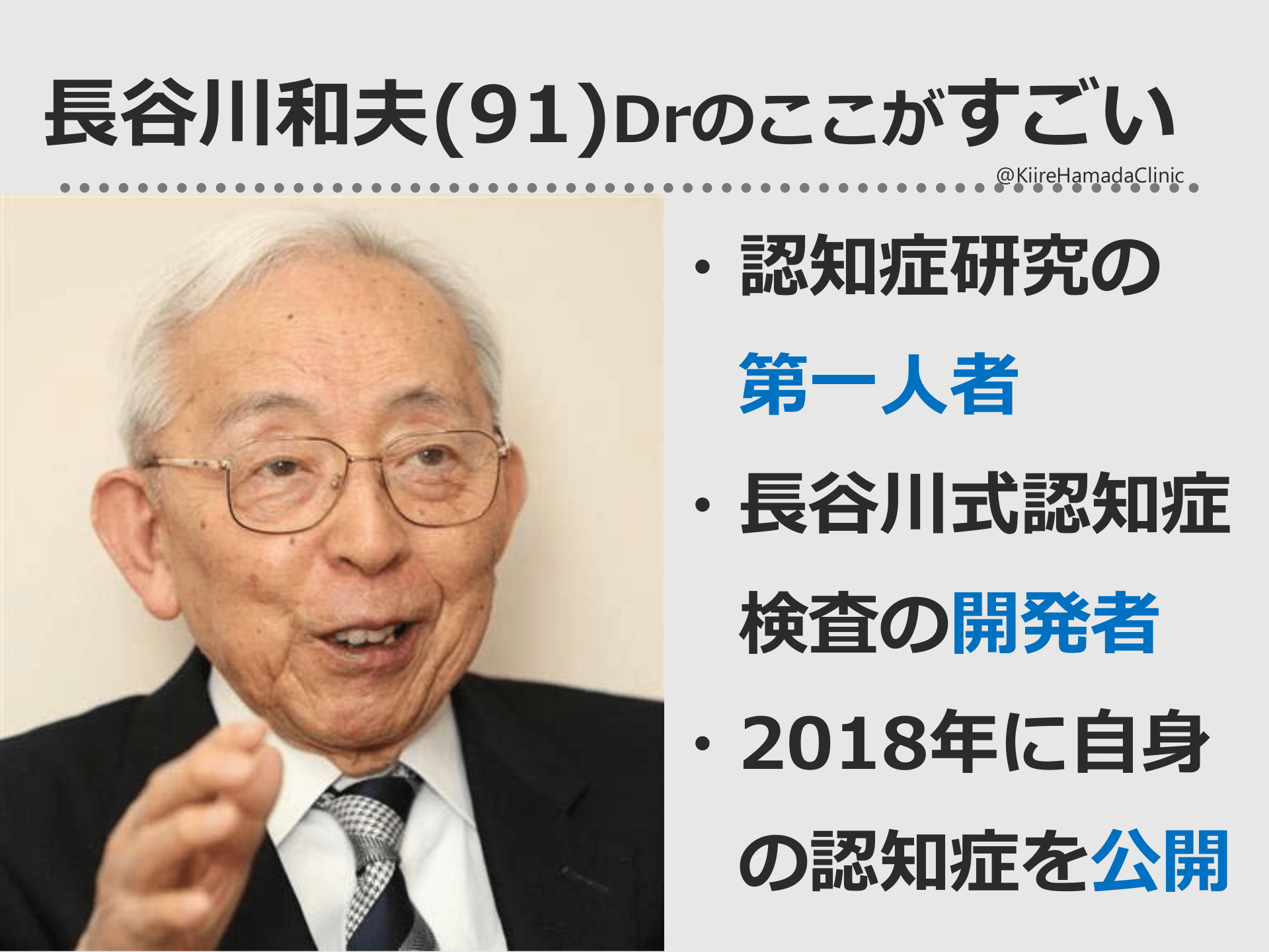 #2. 長谷川和夫(91)Drのここがすごい @KiireHamadaClinic ・認知症研究の 第一人者 ・長谷川式認知症 検査の開発者 ・2018年に自身 の認知症を公開