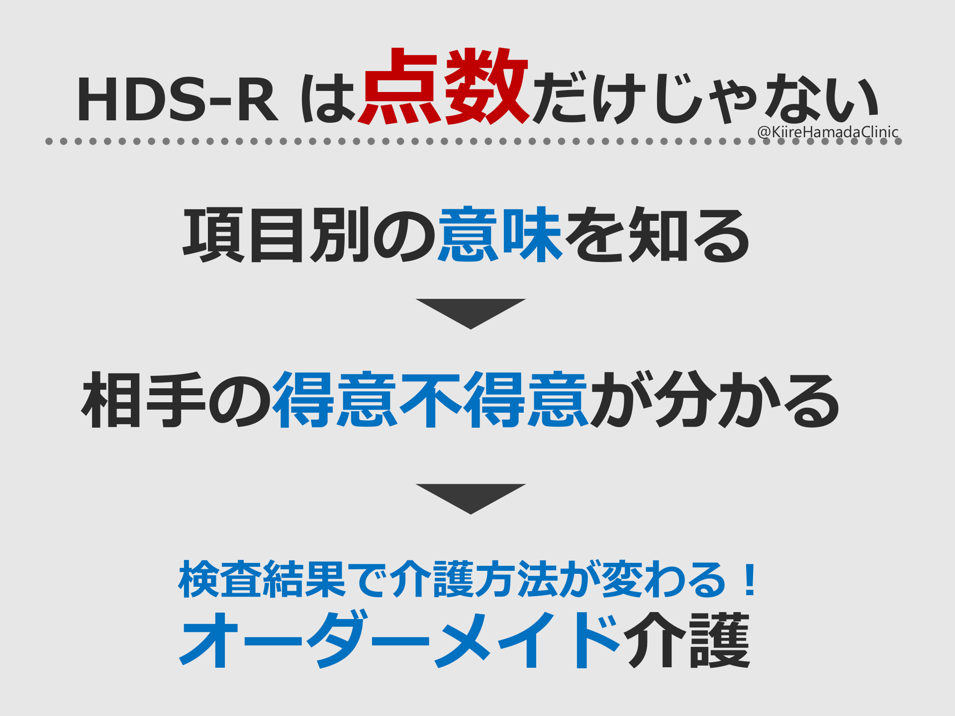 #3. HDS-R は点数だけじゃない @KiireHamadaClinic 項目別の意味を知る 相手の得意不得意が分かる 検査結果で介護方法が変わる! オーダーメイド介護