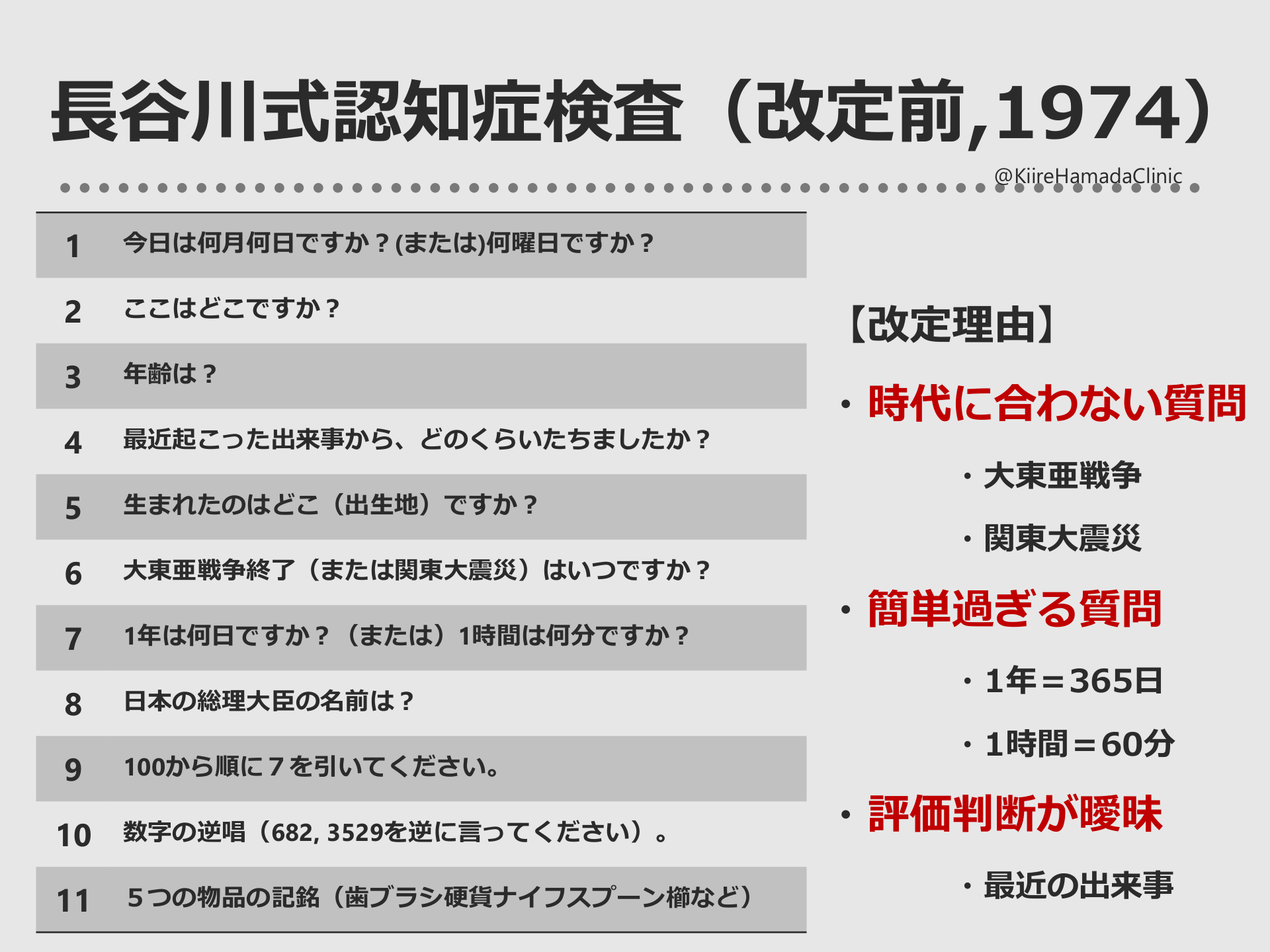 #4. 長谷川式認知症検査(改定前,1974) @KiireHamadaClinic 1 今日は何月何日ですか?(または)何曜日ですか? 2 ここはどこですか? 3 年齢は? 4 最近起こった出来事から、どのくらいたちましたか? 5 生まれたのはどこ(出生地)ですか? 6 大東亜戦争終了(または関東大震災)はいつですか? 7 1年は何日ですか?(または)1時間は何分ですか? 8 日本の総理大臣の名前は? 9 100から順に7を引いてください。 10 数字の逆唱(682, 3529を逆に言ってください)。 11 5つの物品の記銘(歯ブラシ硬貨ナイフスプーン櫛など) 【改定理由】 ・時代に合わない質問 ・大東亜戦争 ・関東大震災 ・簡単過ぎる質問 ・1年=365日 ・1時間=60分 ・評価判断が曖昧 ・最近の出来事