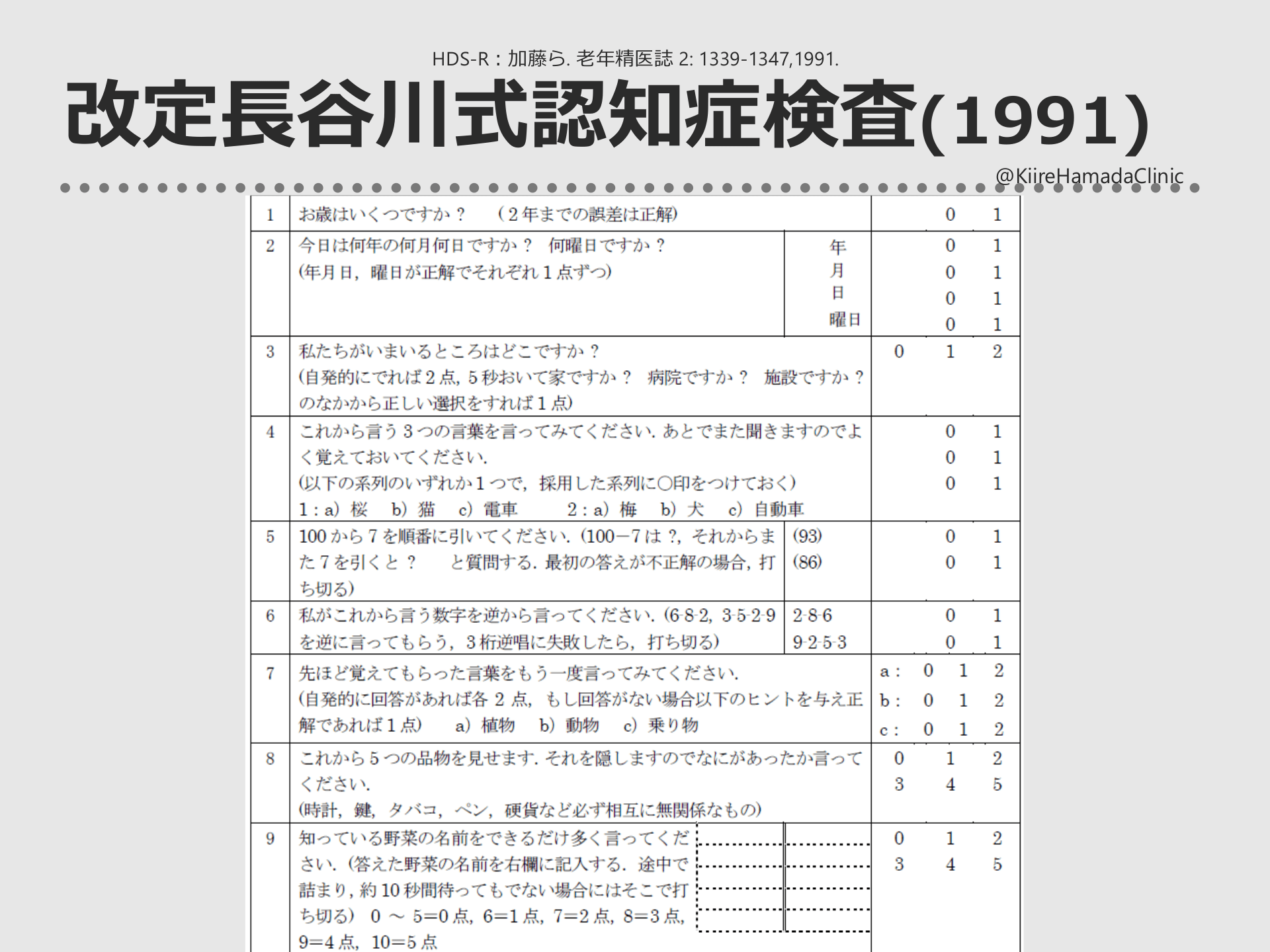 #5. HDS-R:加藤ら. 老年精医誌 2: 1339-1347,1991. 改定長谷川式認知症検査(1991) @KiireHamadaClinic