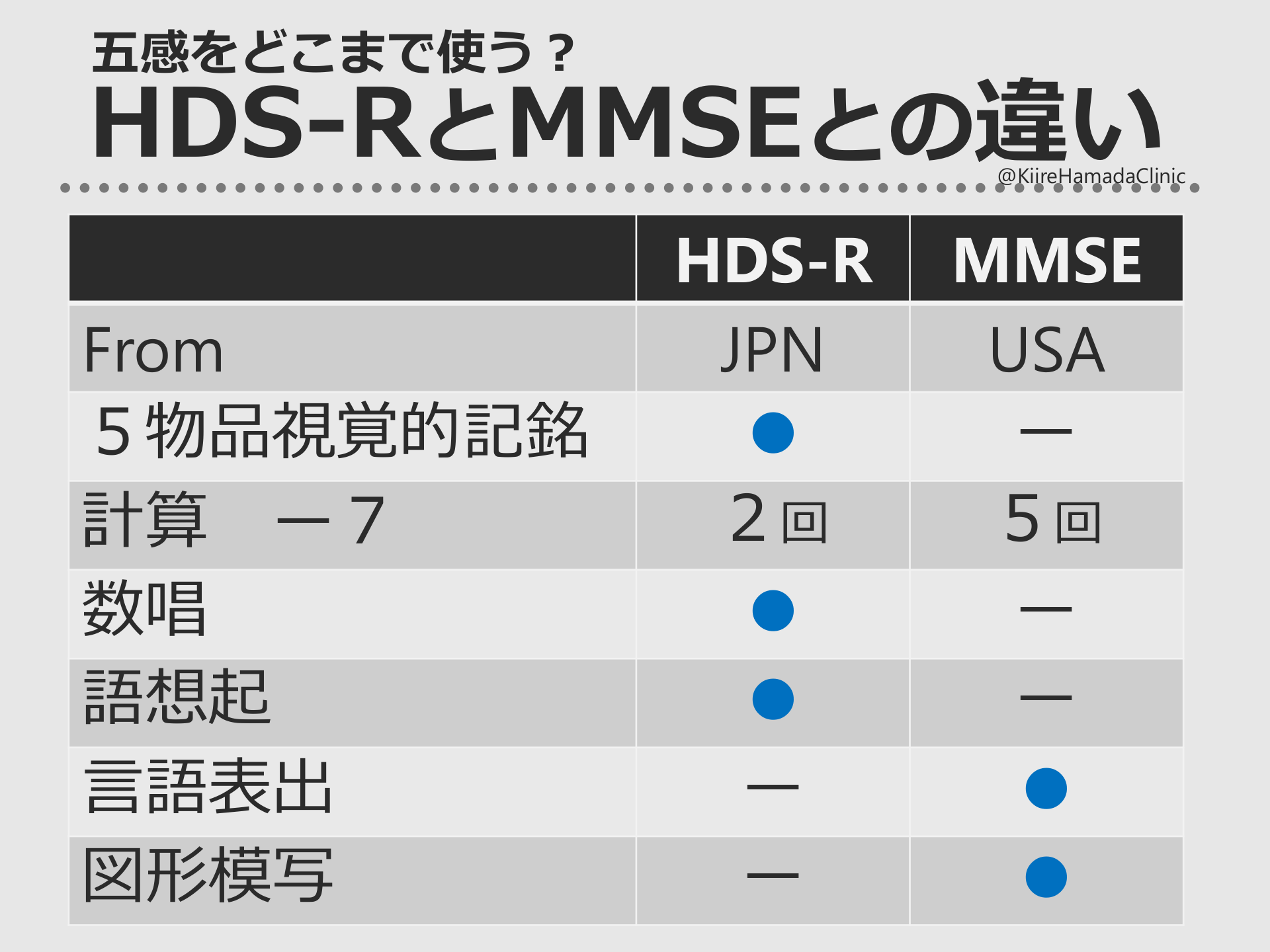 #6. 五感をどこまで使う? HDS-RとMMSEとの違い @KiireHamadaClinic From 5物品視覚的記銘 計算 ー7 数唱 語想起 言語表出 図形模写 HDS-R JPN ● 2回 ● ● ー ー MMSE USA ー 5回 ー ー ● ●