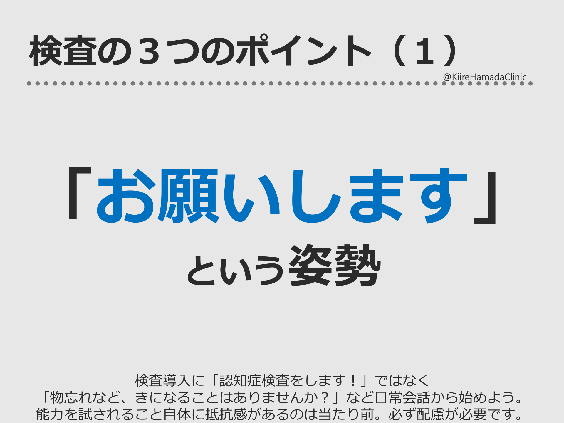 #7. 検査の3つのポイント(1) @KiireHamadaClinic 「お願いします」 という姿勢 検査導入に「認知症検査をします!」ではなく 「物忘れなど、きになることはありませんか?」など日常会話から始めよう。 能力を試されること自体に抵抗感があるのは当たり前。必ず配慮が必要です。