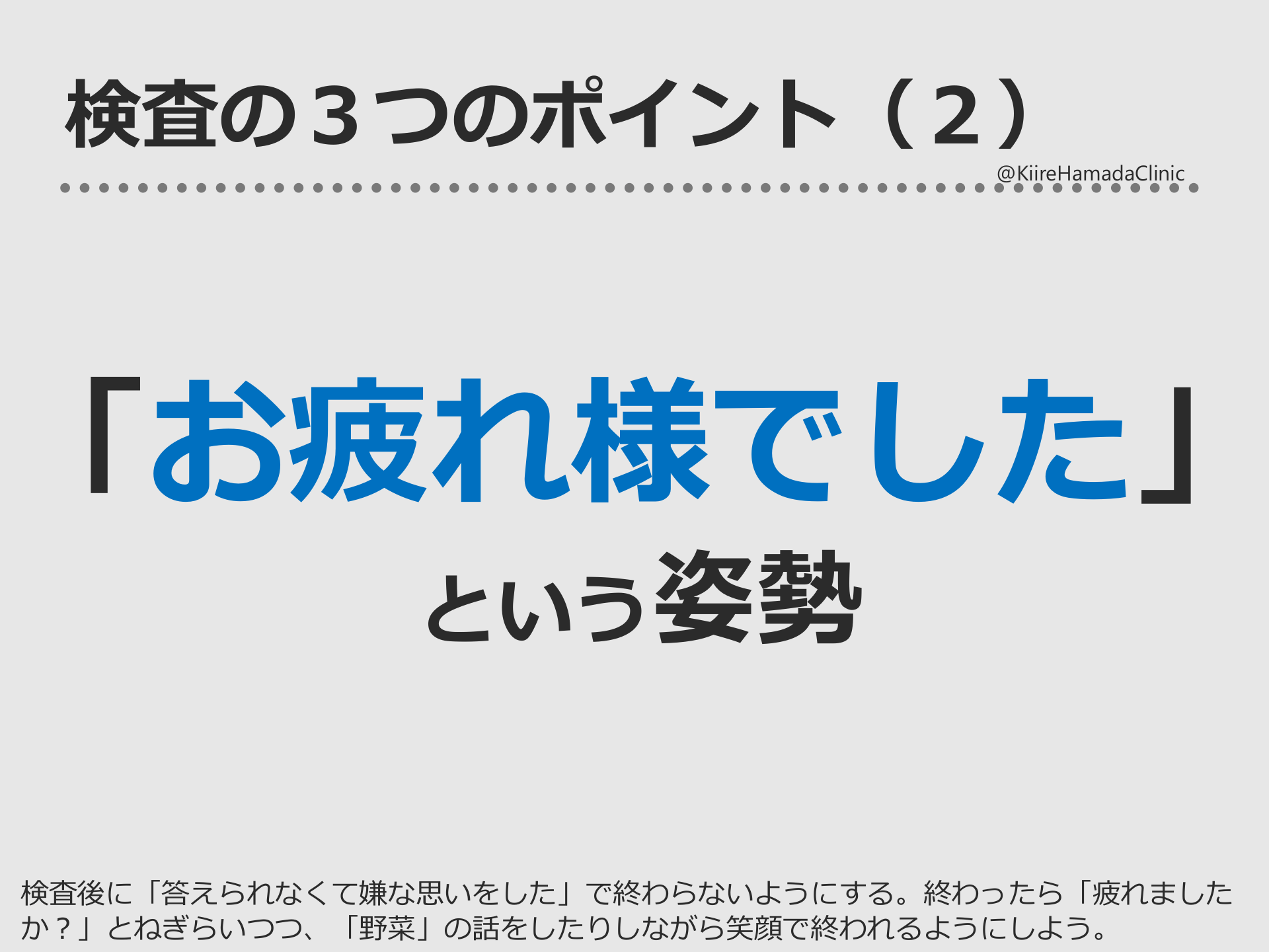 #8. 検査の3つのポイント(2) @KiireHamadaClinic 「お疲れ様でした」 という姿勢 検査後に「答えられなくて嫌な思いをした」で終わらないようにする。終わったら「疲れました か?」とねぎらいつつ、「野菜」の話をしたりしながら笑顔で終われるようにしよう。