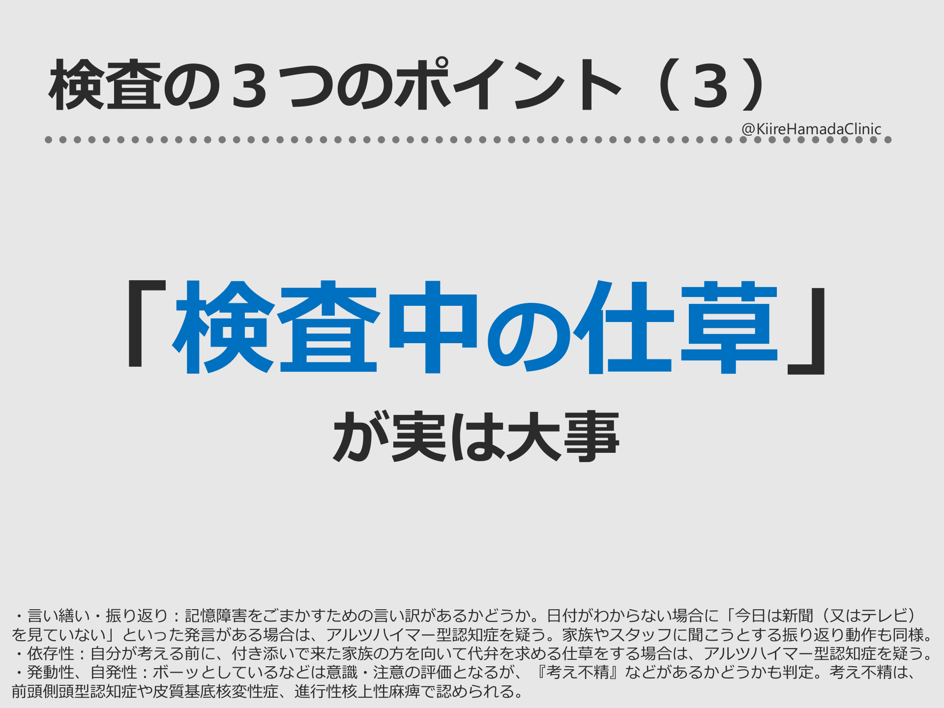 #9. 検査の3つのポイント(3) @KiireHamadaClinic 「検査中の仕草」 が実は大事 ・言い繕い・振り返り:記憶障害をごまかすための言い訳があるかどうか。日付がわからない場合に「今日は新聞(又はテレビ) を見ていない」といった発言がある場合は、アルツハイマー型認知症を疑う。家族やスタッフに聞こうとする振り返り動作も同様。 ・依存性:自分が考える前に、付き添いで来た家族の方を向いて代弁を求める仕草をする場合は、アルツハイマー型認知症を疑う。 ・発動性、自発性:ボーッとしているなどは意識・注意の評価となるが、『考え不精』などがあるかどうかも判定。考え不精は、 前頭側頭型認知症や皮質基底核変性症、進行性核上性麻痺で認められる。