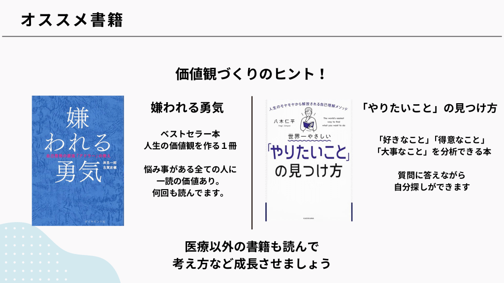 #10. オススメ書籍 価値観づくりのヒント! 嫌われる勇気 ベストセラー本 人生の価値観を作る1冊 悩み事がある全ての人に 一読の価値あり。 何回も読んでます。 医療以外の書籍も読んで 考え方など成長させましょう 「やりたいこと」の見つけ方 「好きなこと」 「得意なこと」 「大事なこと」を分析できる本 質問に答えながら 自分探しができます