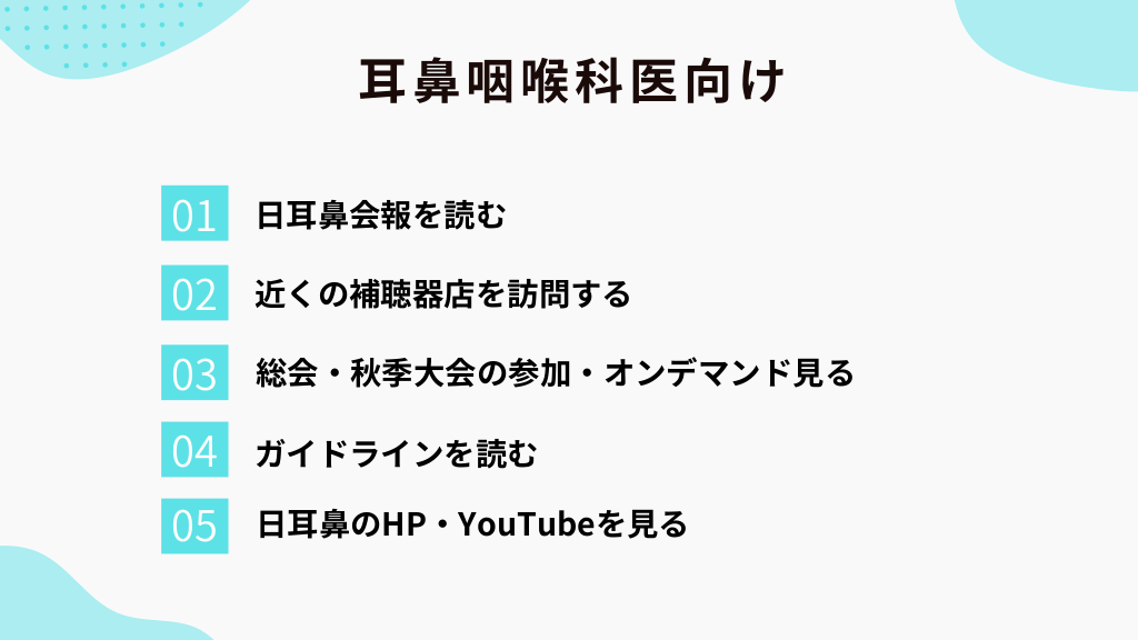 #11. 耳鼻咽喉科医向け 01 日耳鼻会報を読む 02 近くの補聴器店を訪問する 03 総会・秋季大会の参加・オンデマンド見る 04 03 ガイドラインを読む 05 日耳鼻のHP・YouTubeを見る