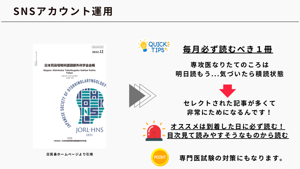 #12. SNSアカウント運用 毎月必ず読むべき1冊 専攻医なりたてのころは 明日読もう...気づいたら積読状態 セレクトされた記事が多くて 非常にためになるんです! オススメは到着した日に必ず読む! QR 目次見て読みやすそうなものから読む 日耳鼻ホームページより引用 専門医試験の対策にもなります。