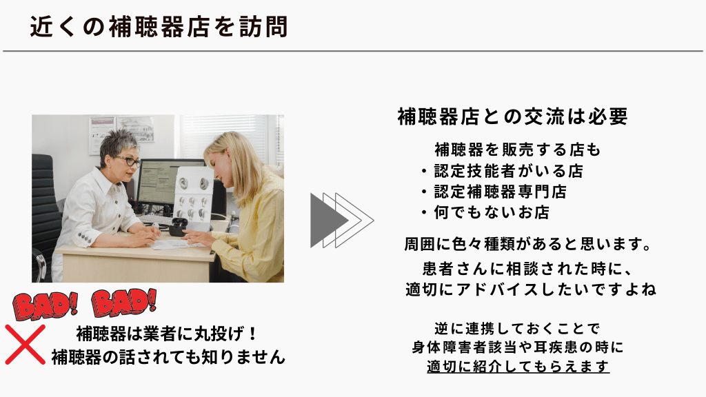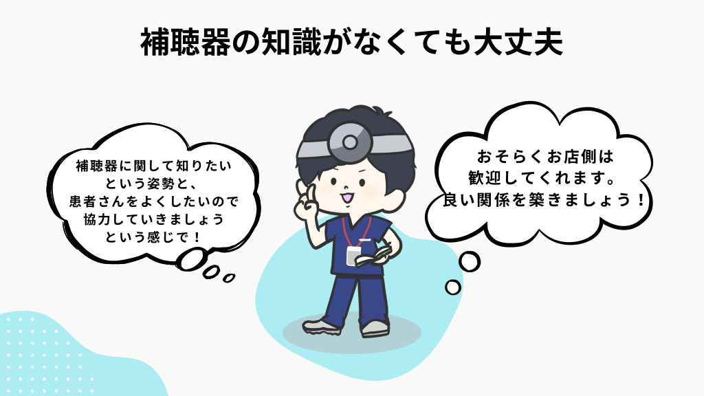 #15. 補聴器の知識がなくても大丈夫 補聴器に関して知りたい という姿勢と、 患者さんをよくしたいので 協力していきましょう という感じで! おそらくお店側は 歓迎してくれます。 良い関係を築きましょう!