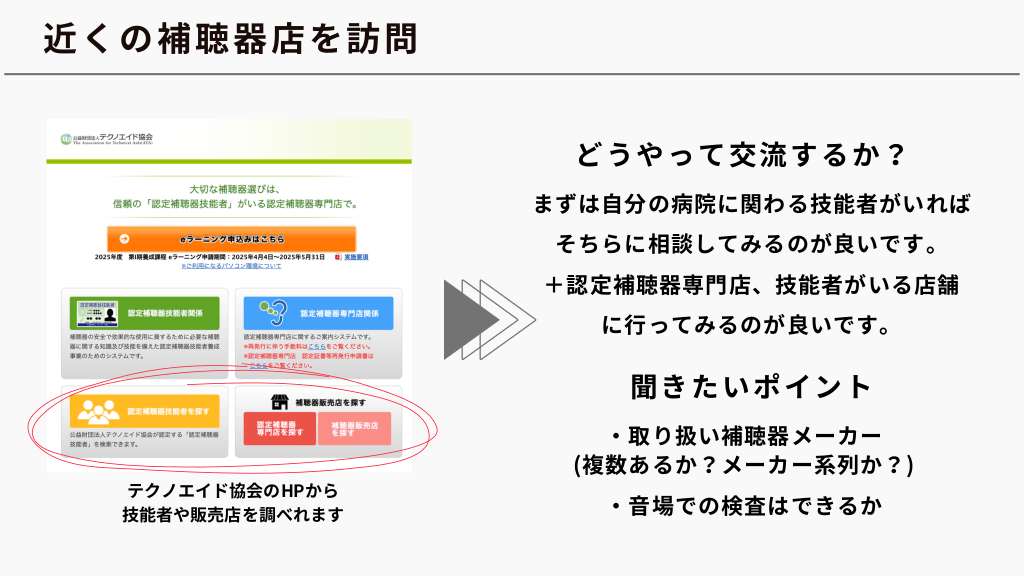 #14. 近くの補聴器店を訪問 どうやって交流するか? まずは自分の病院に関わる技能者がいれば そちらに相談してみるのが良いです。 +認定補聴器専門店、技能者がいる店舗 に行ってみるのが良いです。 聞きたいポイント テクノエイド協会のHPから 技能者や販売店を調べれます ・取り扱い補聴器メーカー QR (複数あるか?メーカー系列か?) ・音場での検査はできるか