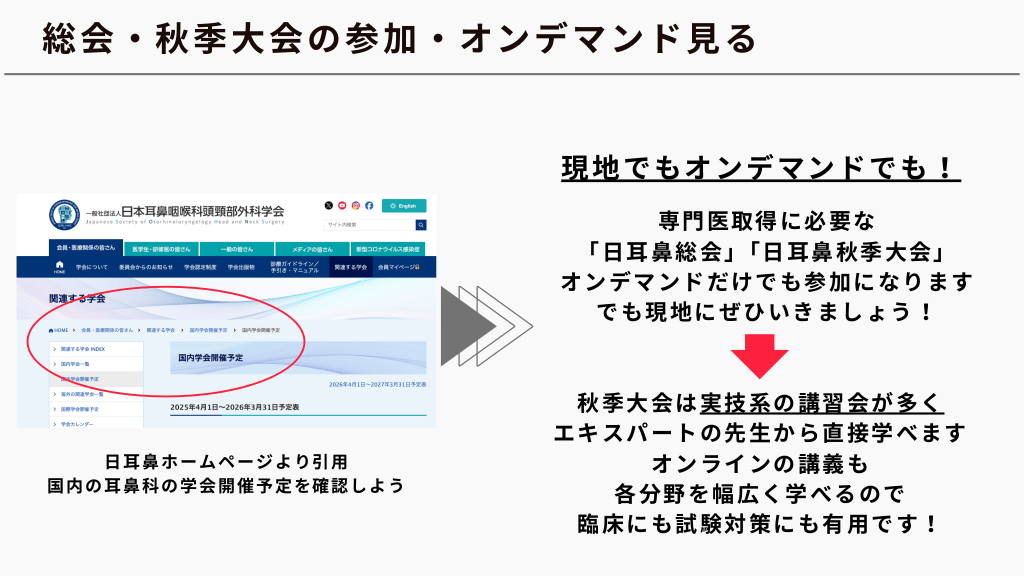 #16. 総会・秋季大会の参加・オンデマンド見る 現地でもオンデマンドでも! 専門医取得に必要な 「 日 耳 鼻 総 会 」「 日 耳 鼻 秋 季 大 会 」 オンデマンドだけでも参加になります でも現地にぜひいきましょう! 日耳鼻ホームページより引用 国内の耳鼻科の学会開催予定を確認しよう 秋季大会は実技系の講習会が多く エ キ スQパ ートの先生から直接学べます R オンラインの講義も 各分野を幅広く学べるので 臨床にも試験対策にも有用です!