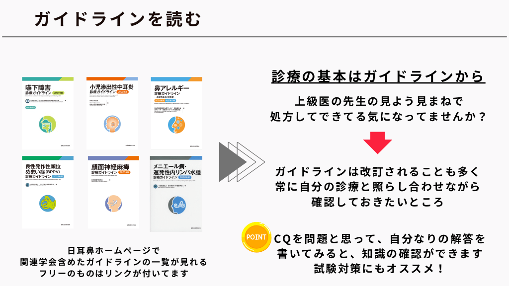 #17. ガイドラインを読む 診療の基本はガイドラインから 上級医の先生の見よう見まねで 処方してできてる気になってませんか? ガイドラインは改訂されることも多く 常に自分の診療と照らし合わせながら 確認しておきたいところ QR 日耳鼻ホームページで 関連学会含めたガイドラインの一覧が見れる フリーのものはリンクが付いてます CQを問題と思って、自分なりの解答を 書いてみると、知識の確認ができます 試験対策にもオススメ!