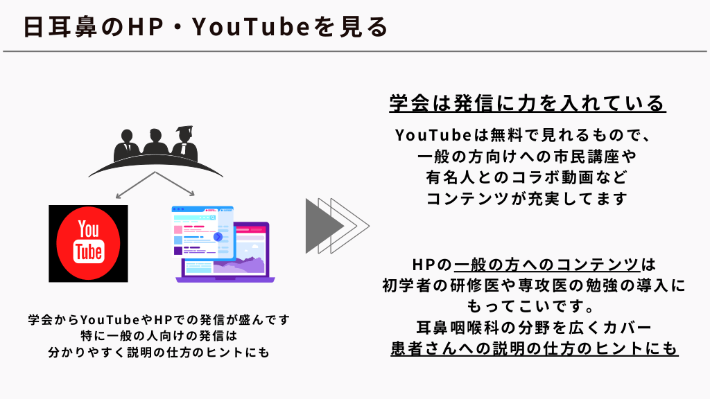 #18. 日耳鼻のHP・YouTubeを見る 学会は発信に力を入れている YouTubeは無料で見れるもので、 一般の方向けへの市民講座や 有名人とのコラボ動画など コンテンツが充実してます 学会からYouTubeやHPでの発信が盛んです 特に一般の人向けの発信は 分かりやすく説明の仕方のヒントにも HPの一般の方へのコンテンツは 初学者の研修医や専攻医の勉強の導入に QR もってこいです。 耳鼻咽喉科の分野を広くカバー 患者さんへの説明の仕方のヒントにも