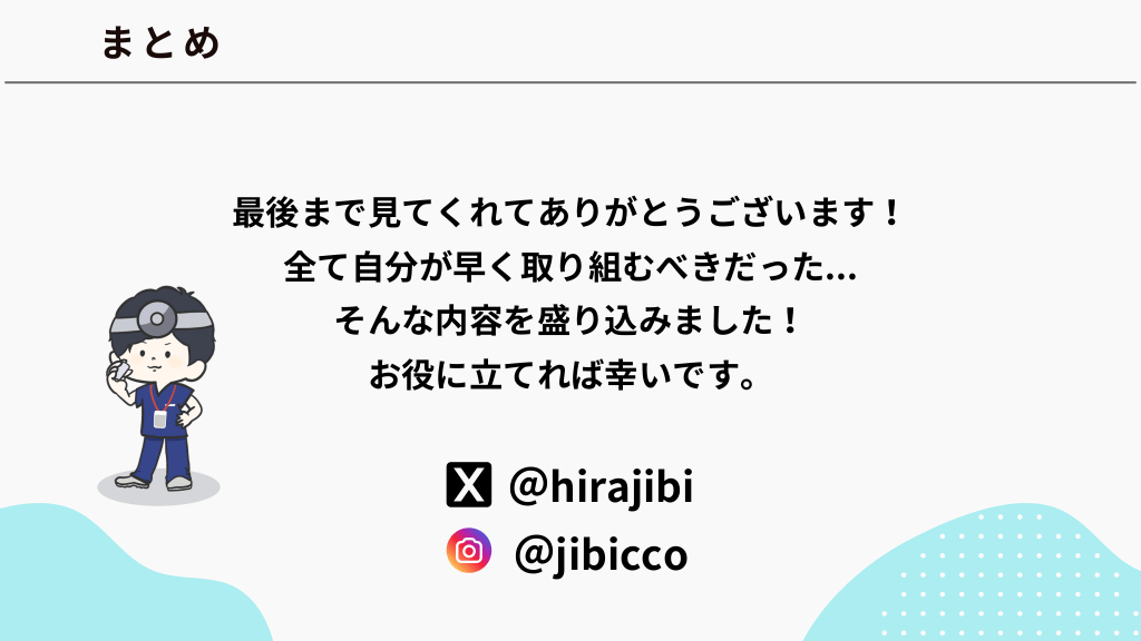 #19. まとめ 最後まで見てくれてありがとうございます! 全て自分が早く取り組むべきだった... そんな内容を盛り込みました! お役に立てれば幸いです。 @hirajibi @jibicco