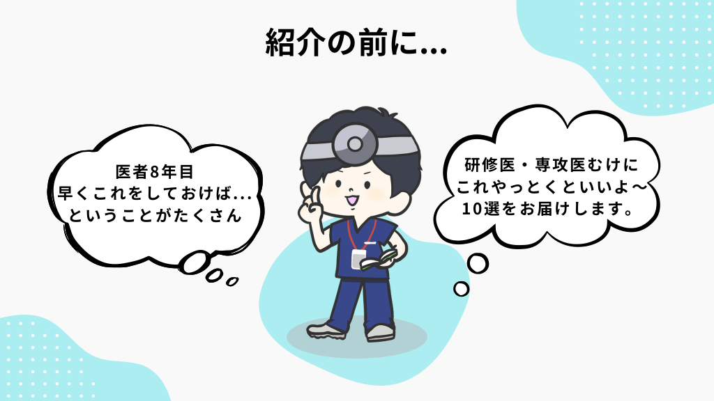 #2. 紹介の前に... 医者8年目 早くこれをしておけば... ということがたくさん 研修医・専攻医むけに これやっとくといいよ〜 10選をお届けします。