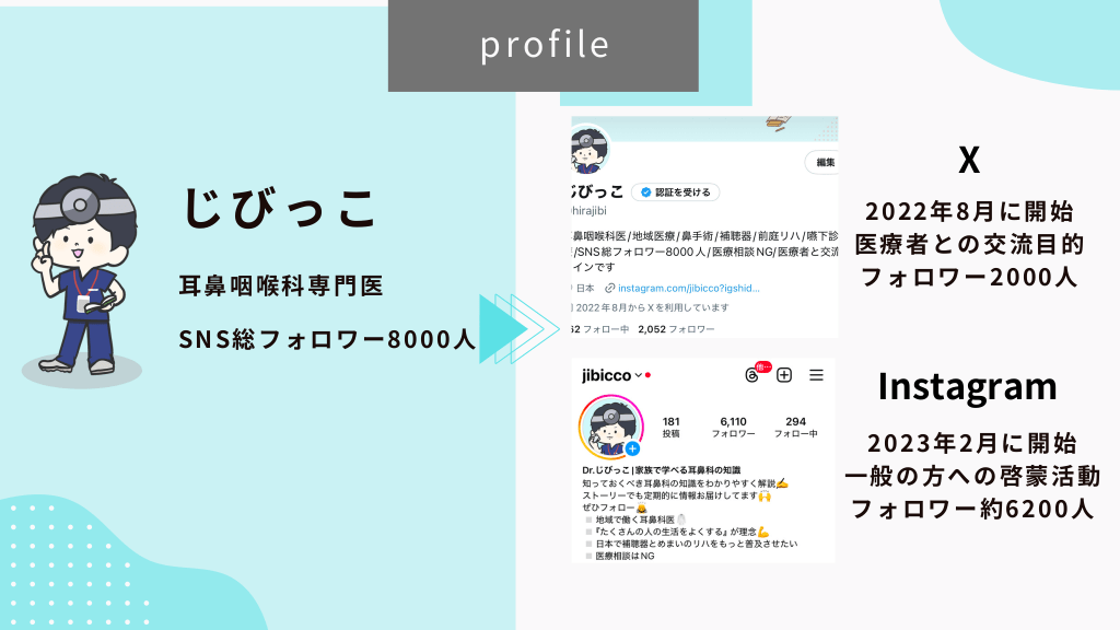 #20. profile じびっこ 耳鼻咽喉科専門医 X 2022年8月に開始 医療者との交流目的 フォロワー2000人 SNS総フォロワー8000人 Instagram 2023年2月に開始 一般の方への啓蒙活動 フォロワー約6200人