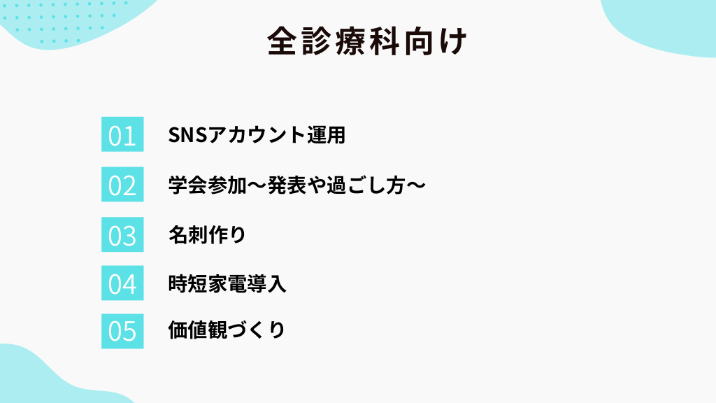 #3. 全診療科向け 01 SNSアカウント運用 02 学会参加〜発表や過ごし方〜 03 名刺作り 04 03 時短家電導入 05 価値観づくり