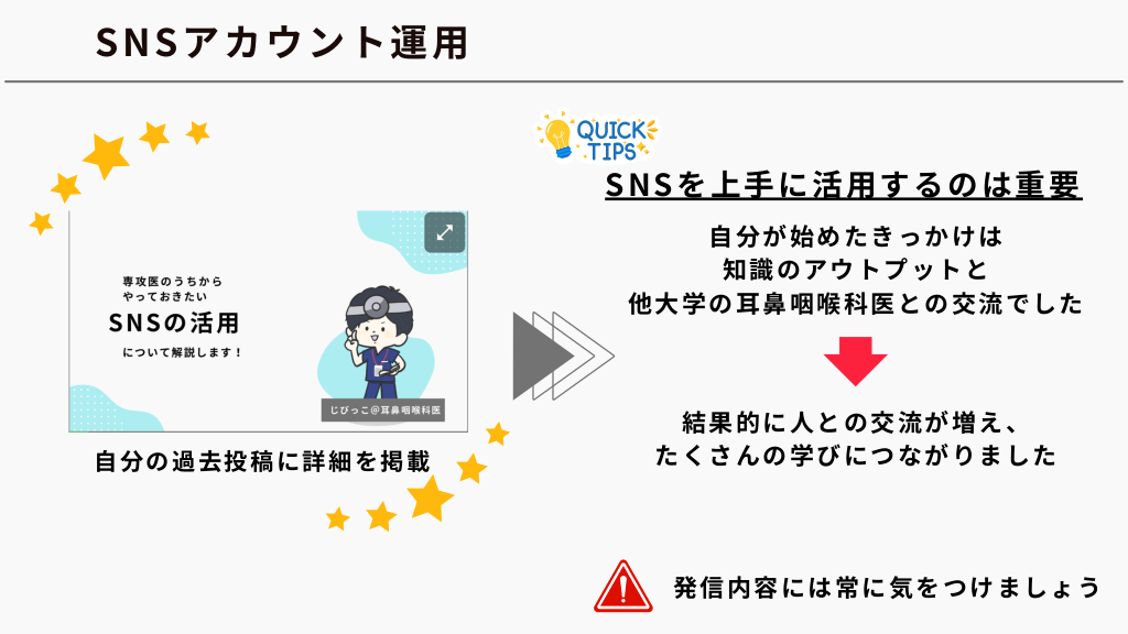 #4. SNSアカウント運用 SNSを上手に活用するのは重要 自分が始めたきっかけは 知識のアウトプットと 他大学の耳鼻咽喉科医との交流でした 自分の過去投稿に詳細を掲載 結果的に人との交流が増え、 たくさんの学びにつながりました QR 発信内容には常に気をつけましょう