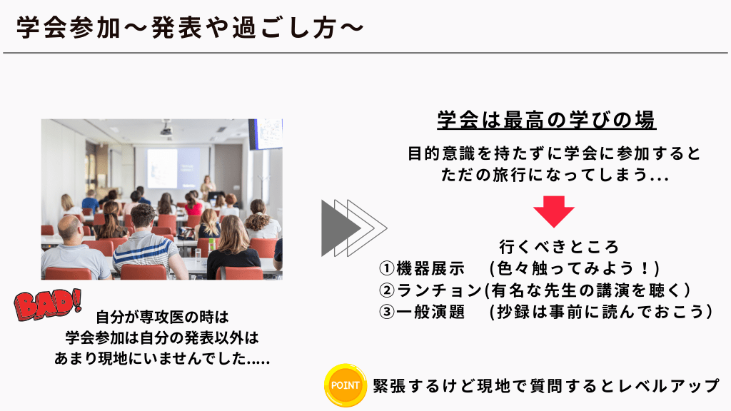 #5. 学会参加〜発表や過ごし方〜 学会は最高の学びの場 目的意識を持たずに学会に参加すると ただの旅行になってしまう... 自分が専攻医の時は 学会参加は自分の発表以外は あまり現地にいませんでした..... 行くべきところ ①機器展示 (色々触ってみよう!) ②ランチョン(有名な先生の講演を聴く) ③ 一 般 演Q題 (抄録は事前に読んでおこう) R 緊張するけど現地で質問するとレベルアップ