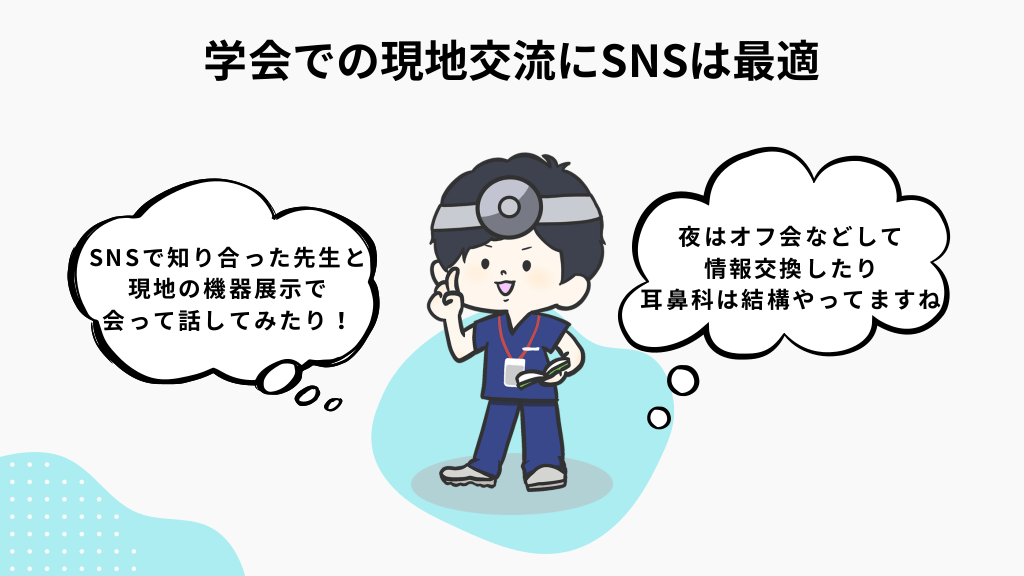 #6. 学会での現地交流にSNSは最適 SNSで知り合った先生と 現地の機器展示で 会って話してみたり! 夜はオフ会などして 情報交換したり 耳鼻科は結構やってますね