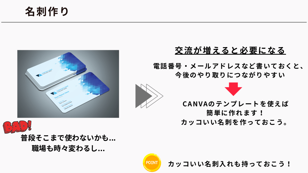 #7. 名刺作り 交流が増えると必要になる 電話番号・メールアドレスなど書いておくと、 今後のやり取りにつながりやすい CANVAのテンプレートを使えば 簡単に作れます! カッコいい名刺を作っておこう。 普段そこまで使わないかも... 職場も時々変わるし... QR カッコいい名刺入れも持っておこう!