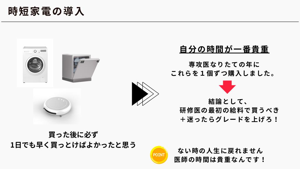 #8. 時短家電の導入 自分の時間が一番貴重 専攻医なりたての年に これらを1個ずつ購入しました。 結論として、 研修医の最初の給料で買うべき +迷ったらグレードを上げろ! 買った後に必ず 1日でも早く買っとけばよかったと思う QR ない時の人生に戻れません 医師の時間は貴重なんです!