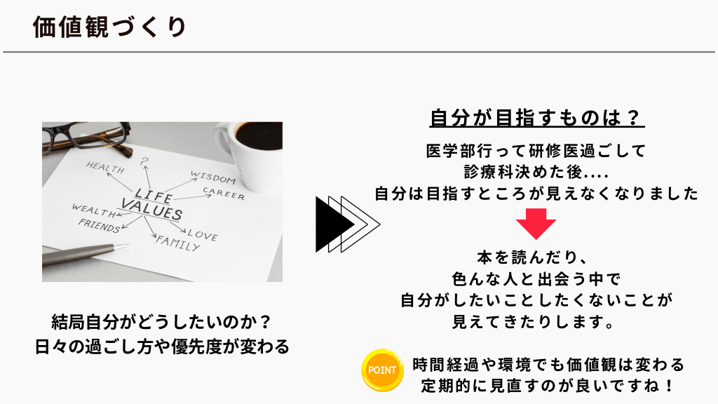 #9. 価値観づくり 自分が目指すものは? 医学部行って研修医過ごして 診療科決めた後.... 自分は目指すところが見えなくなりました 結局自分がどうしたいのか? 日々の過ごし方や優先度が変わる 本を読んだり、 色んな人と出会う中で 自分がしたいことしたくないことが QR 見えてきたりします。 時間経過や環境でも価値観は変わる 定期的に見直すのが良いですね!