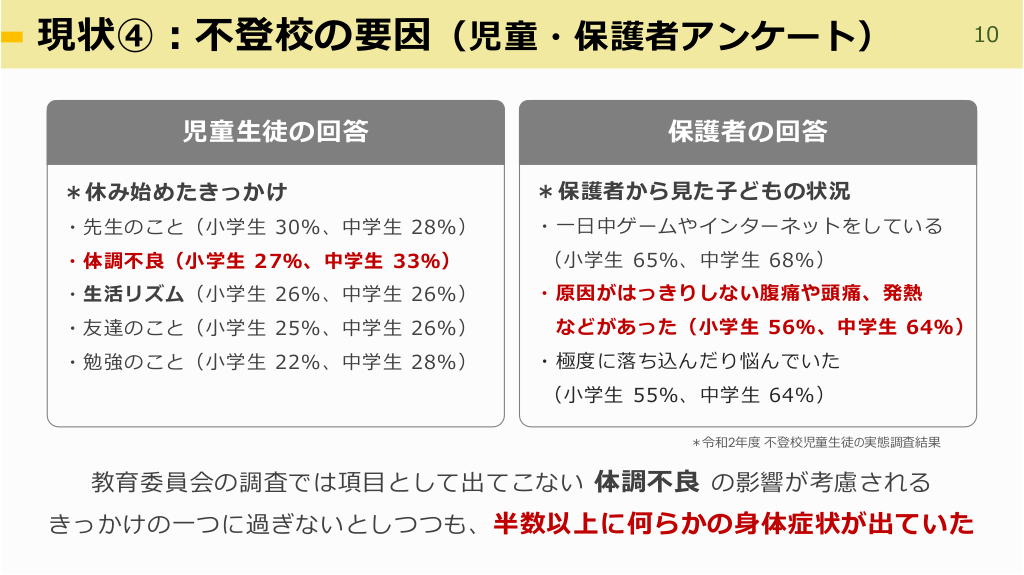 #10. 現状④︓不登校の要因(児童・保護者アンケート) 児童⽣徒の回答 保護者の回答 *休み始めたきっかけ *保護者から⾒た⼦どもの状況 ・先⽣のこと(⼩学⽣ 30%、中学⽣ 28%) ・⼀⽇中ゲームやインターネットをしている ・体調不良(⼩学⽣ 27%、中学⽣ 33%) ・⽣活リズム(⼩学⽣ 26%、中学⽣ 26%) ・友達のこと(⼩学⽣ 25%、中学⽣ 26%) ・勉強のこと(⼩学⽣ 22%、中学⽣ 28%) 10 (⼩学⽣ 65%、中学⽣ 68%) ・原因がはっきりしない腹痛や頭痛、発熱 などがあった(⼩学⽣ 56%、中学⽣ 64%) ・極度に落ち込んだり悩んでいた (⼩学⽣ 55%、中学⽣ 64%) *令和2年度 不登校児童⽣徒の実態調査結果 教育委員会の調査では項⽬として出てこない 体調不良 の影響が考慮される きっかけの⼀つに過ぎないとしつつも、 半数以上に何らかの⾝体症状が出ていた