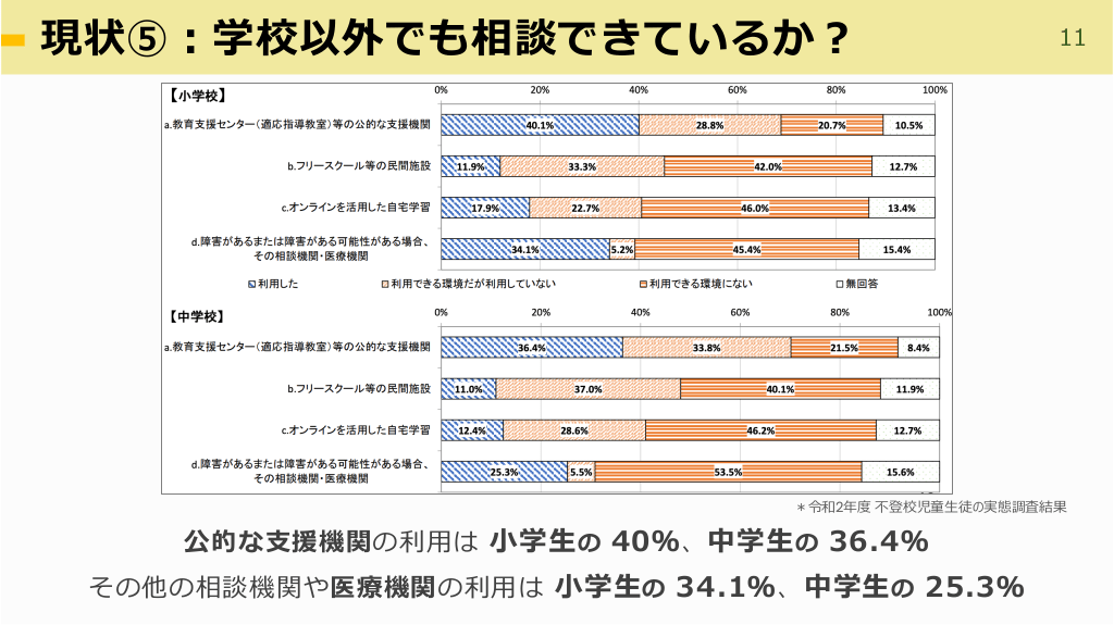 #11. 現状⑤︓学校以外でも相談できているか︖ 11 *令和2年度 不登校児童⽣徒の実態調査結果 公的な⽀援機関の利⽤は ⼩学⽣ の 40% 、 中学⽣ の 36.4% その他の相談機関や医療機関の利⽤は ⼩学⽣ の 34.1% 、 中学⽣ の 25.3%